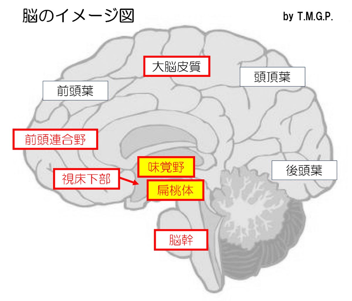 その後、内臓感覚の情報が扁桃体(重要)で過去の記憶も合わせて伝わり、視床下部へ至り、“好き”“嫌い”の判断をするわけです。
