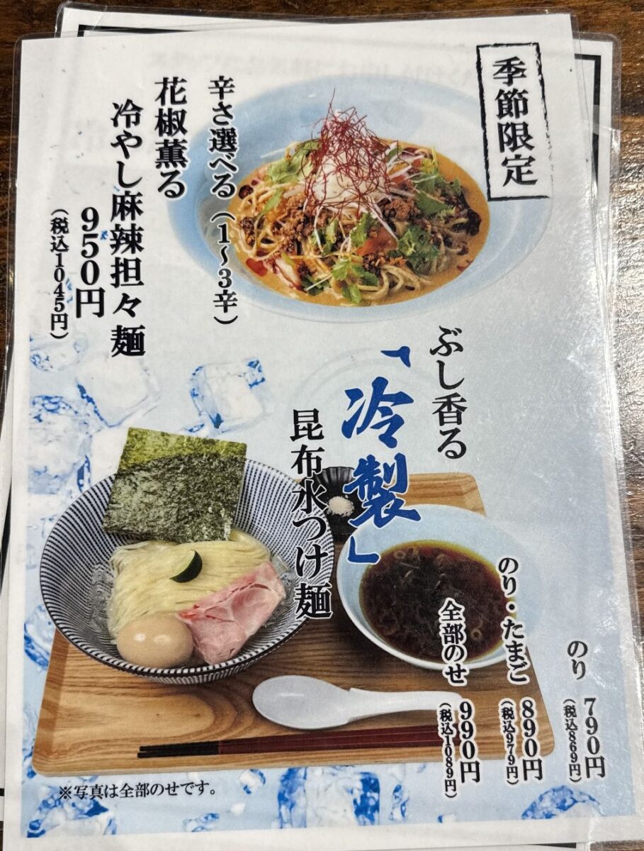 季節限定として「花椒薫る冷やし麻辣担々麺」や「ぶし香る冷製昆布水つけ麺」なども提供。