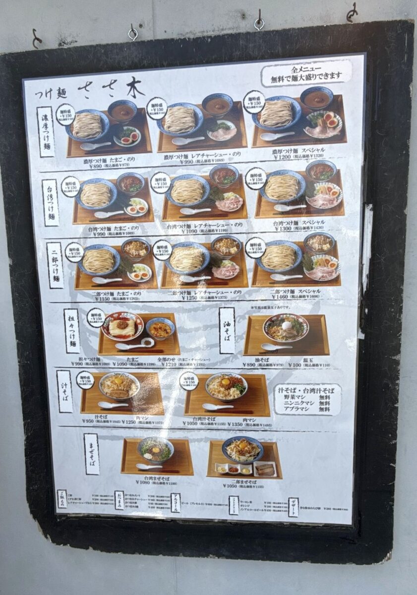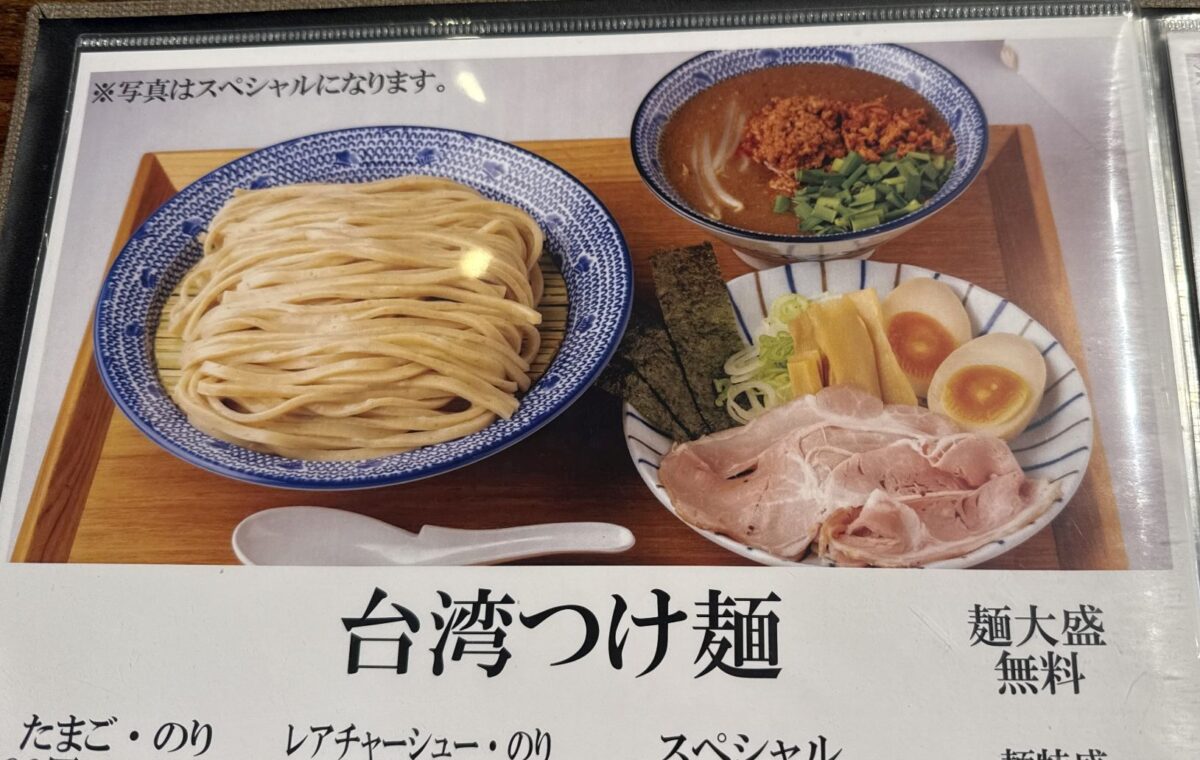 メインのつけ麺も「濃厚つけ麺」「台湾つけ麺」「二郎つけ麺」「担々つけ麺」など種類豊富。