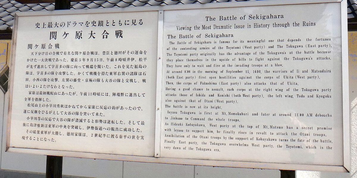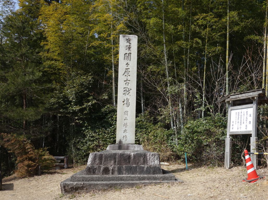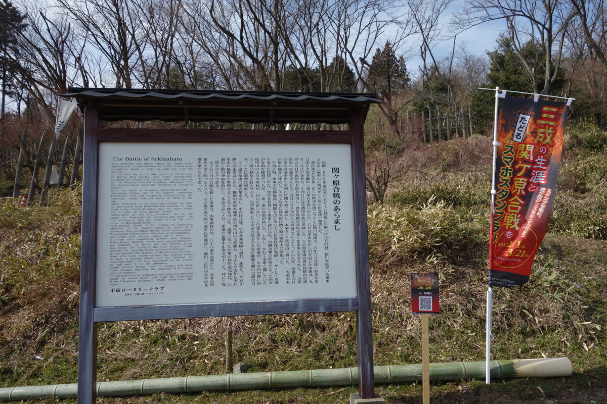 笹尾山からは合戦の全容を確認することができます。合戦当初は西軍が押していたのでそれをリアルタイムで見ている金吾中将の迷いは理解できますね。(伝)では家康の射撃で寝返り(西軍から東軍へ)を決意したというが、いったいどこから小早川陣営に弾を撃ったのかということと、激しい戦闘中にこの弾が家康から撃たれたものだとどうしてわかったのかという疑問は残る。
