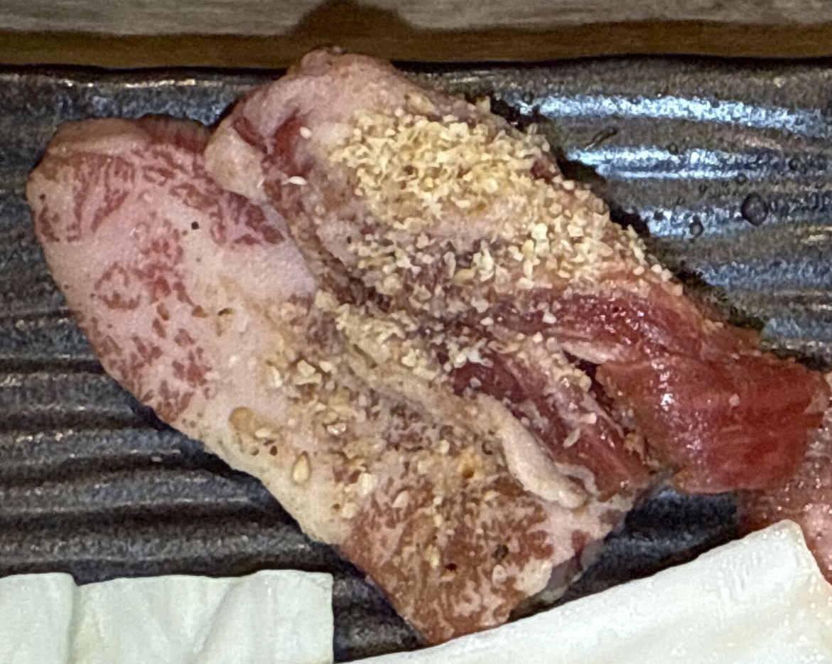 できればハラミを食したかったが、残念ながら? セットの部位はカルビ。推定、前バラかトモバラと思われる。まあ普通。