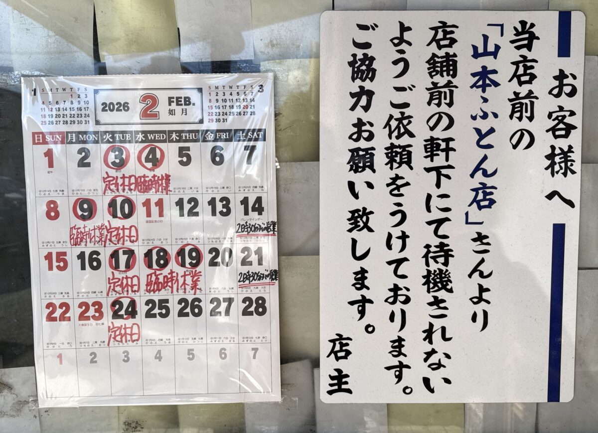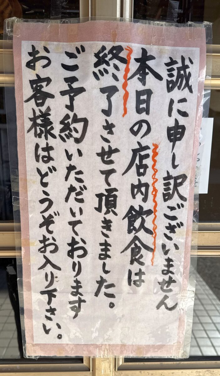 当日も「本日の店内飲食は終了」と開店時に掲示されていた。