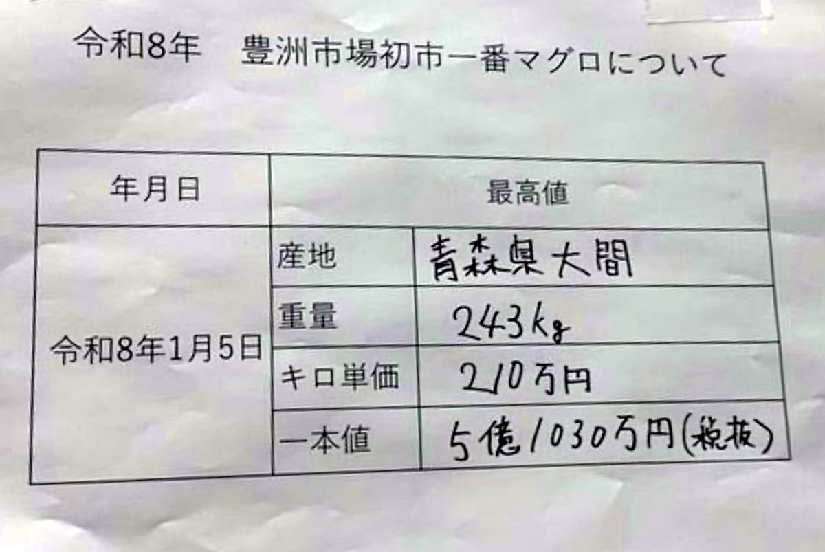 豊洲市場初市1番マグロ 2026年は「すしざんまい」の喜代村が5億円強で落札