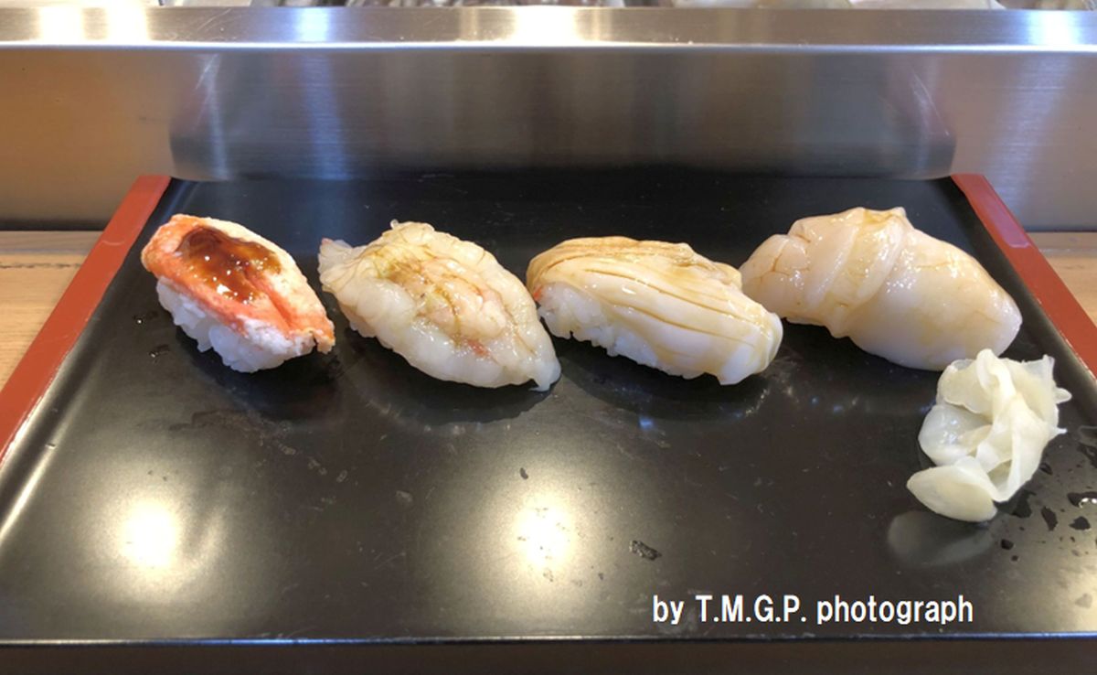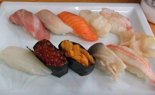 本マグロ、イカ、サーモン、ズワイガニ、エビ、ホタテ、キタムラサキウニ(推測)、イクラ。