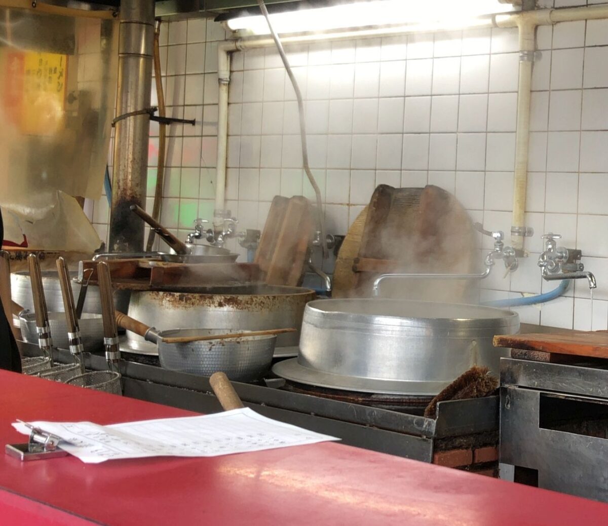 スープ製造調理器具は寸胴ではなく熱効率の良い羽釜使用で「呼び戻し」という調理方法の特徴を持つ。