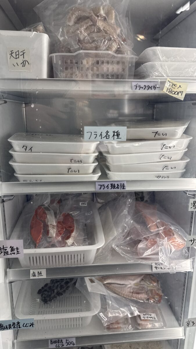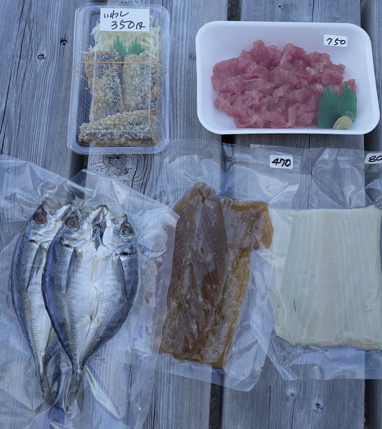 それでもキハダマグロの中落(本命のメバチマグロは勝浦で未入荷を確認済みのため代替購入)、自家製イワシ惣菜、同じく自家製アジの干物とイラギ(サメ)の干物2種を購入。