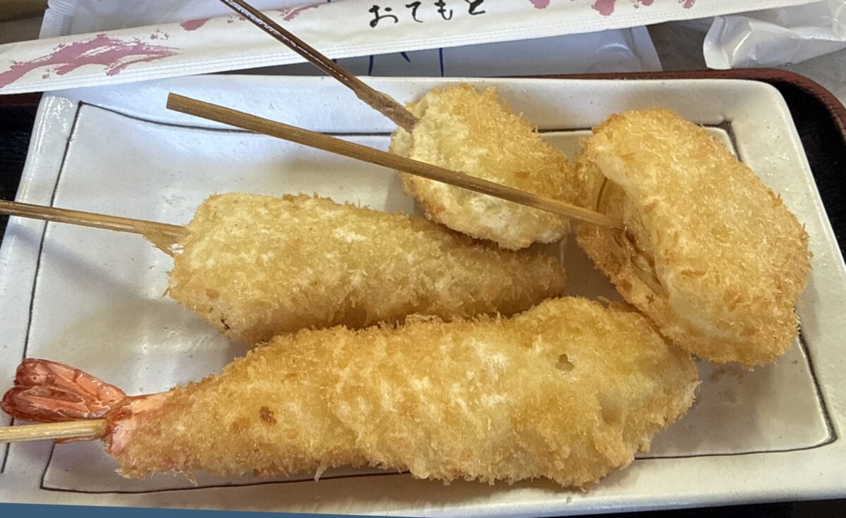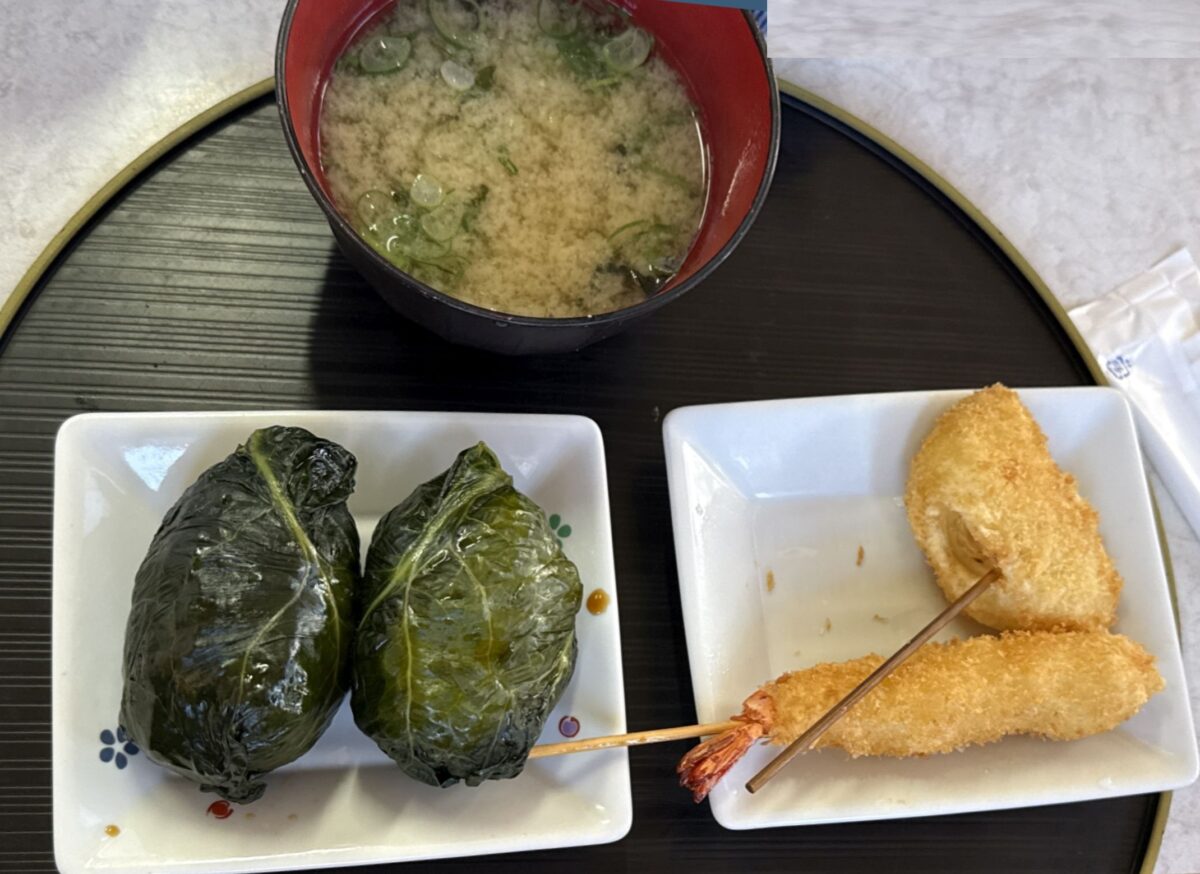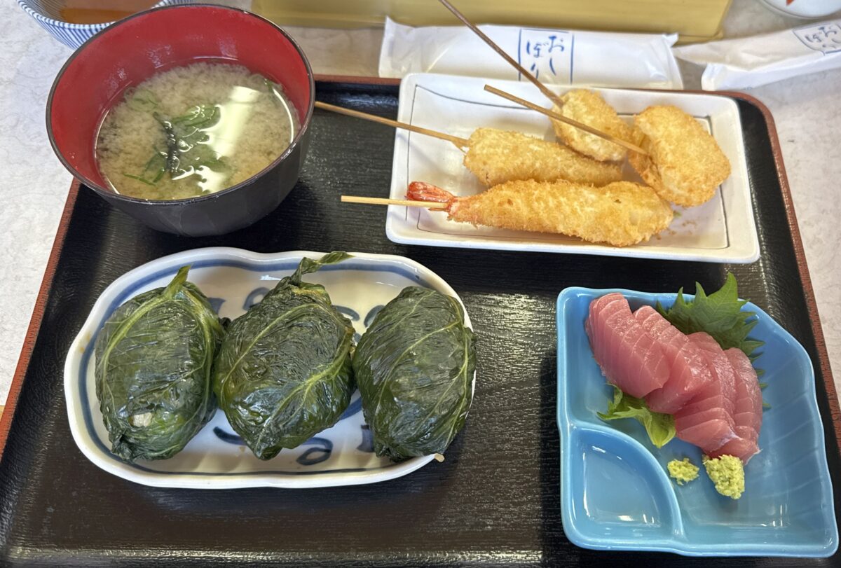 めはり寿司に揚げたての串がつき、ついでに刺身もあるのがちょっと嬉しい。