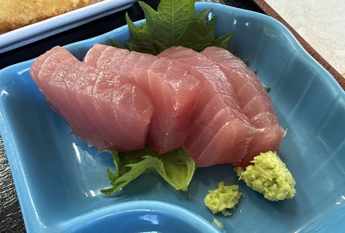 刺身はちょっと色が薄目のキハダマグロでモチモチ加減はボチボチ。