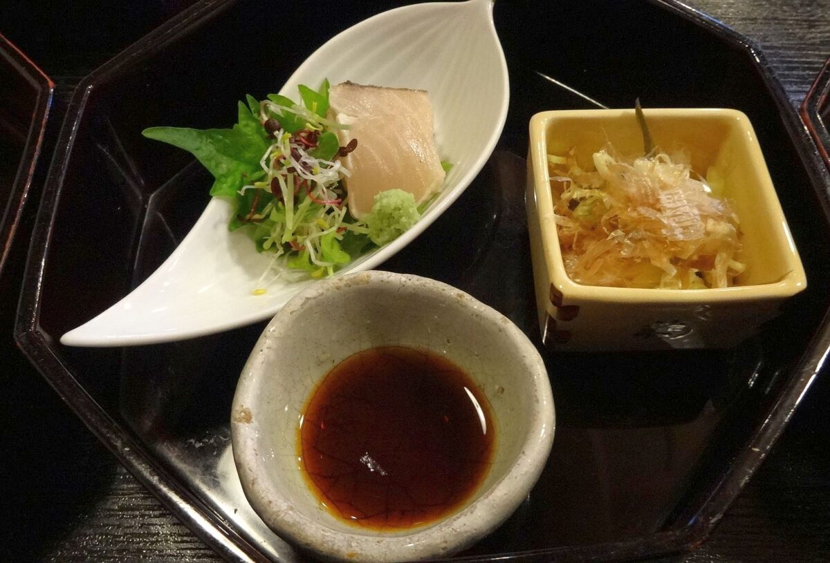 刺身はサワラのタタキ。煮物の赤いのはトマト。いずれも薄味で上品な印象です。