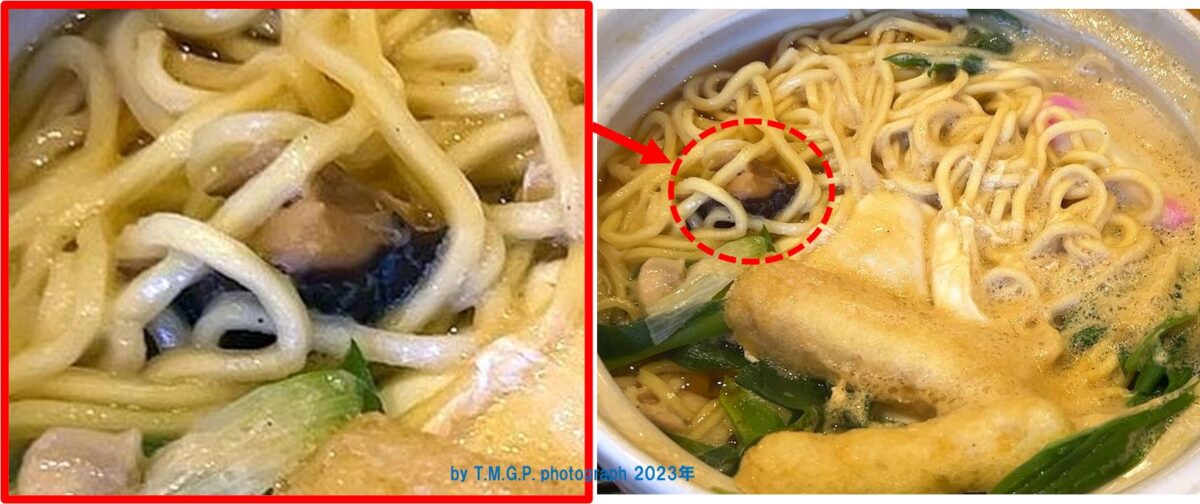 以前の鍋焼きラーメンには干しシイタケが半カット投入されていた(気づいたのが1ケだけだったので、もしかするともっと多いのかもしれない)。