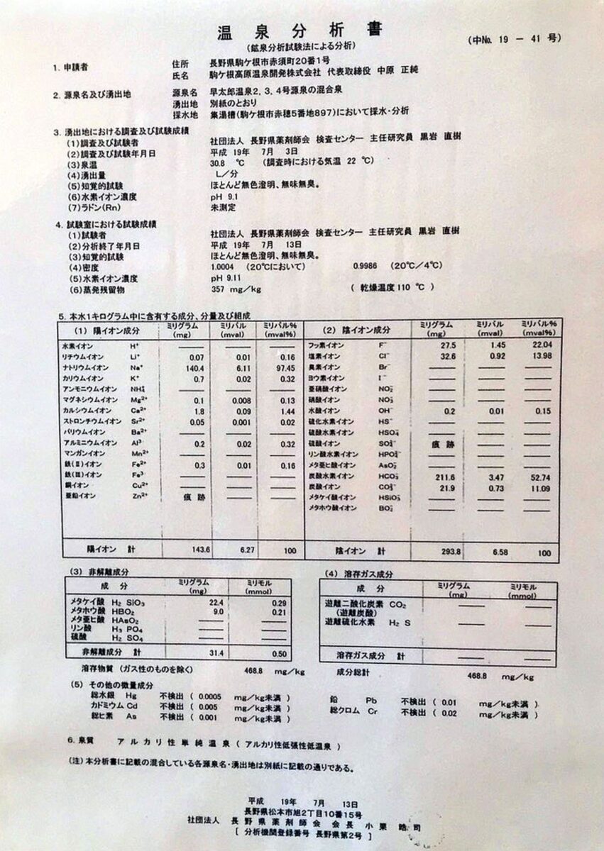 泉質名の「単純温泉」がつく理由は源泉温度が30℃(25℃以上で温泉であり療養泉となる)あるものの、源泉(混合泉)の溶存成分が基準値(1,000mg)の半分も満たない468.8mgと成分が薄いため。