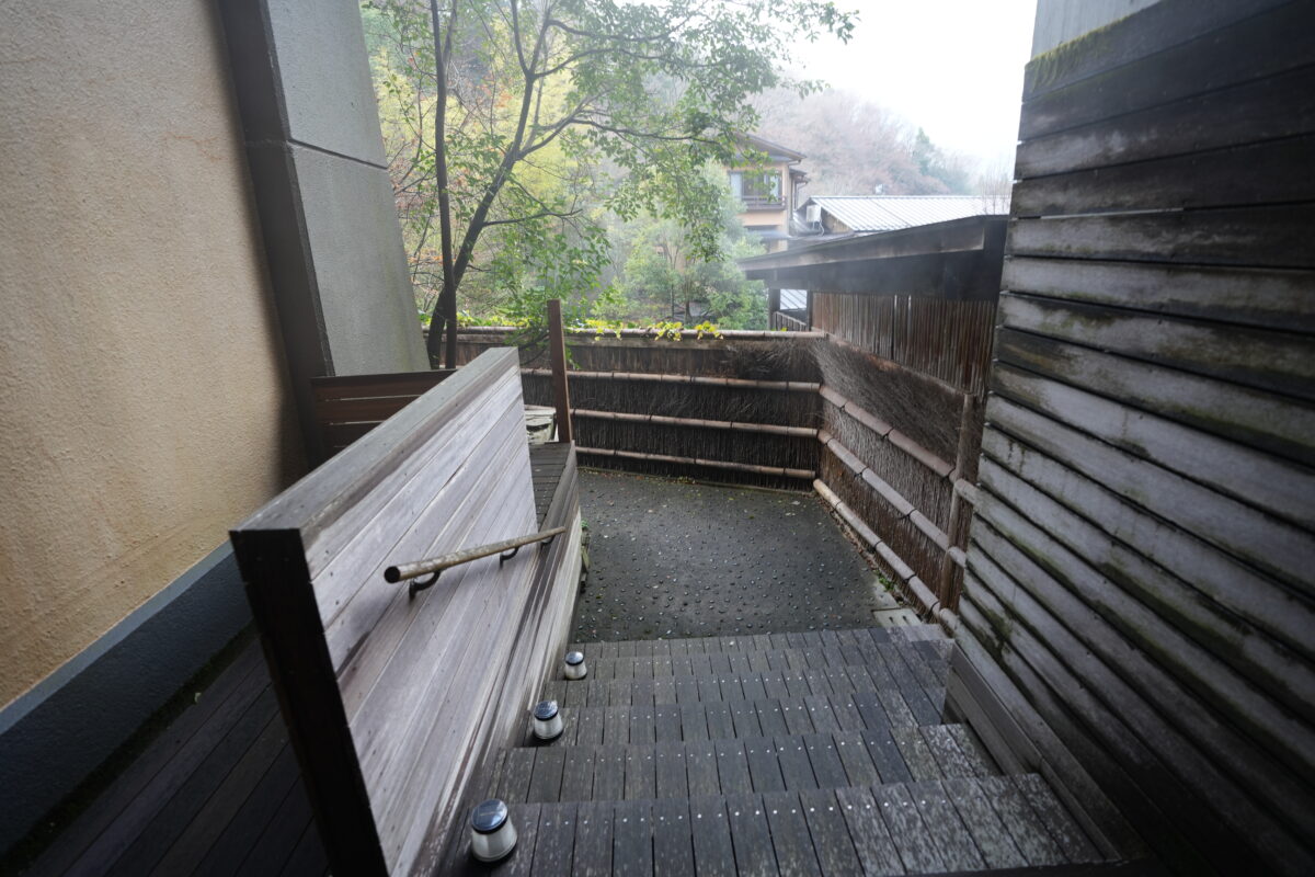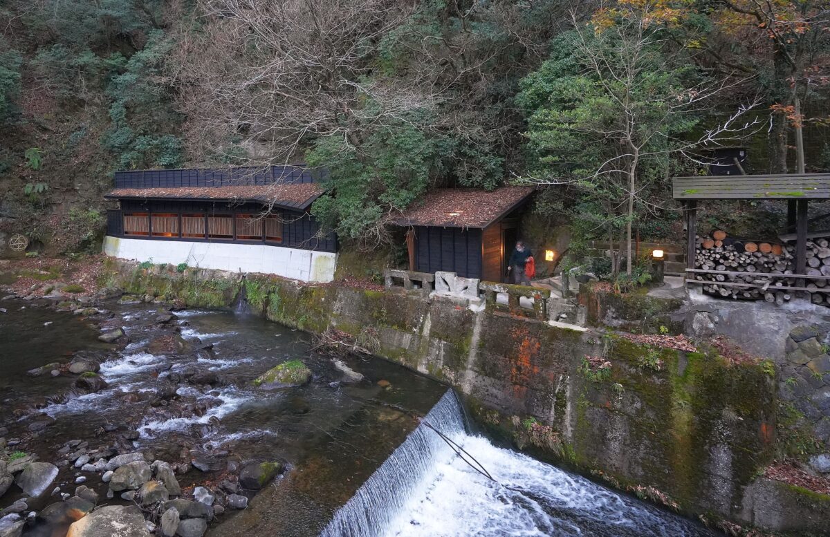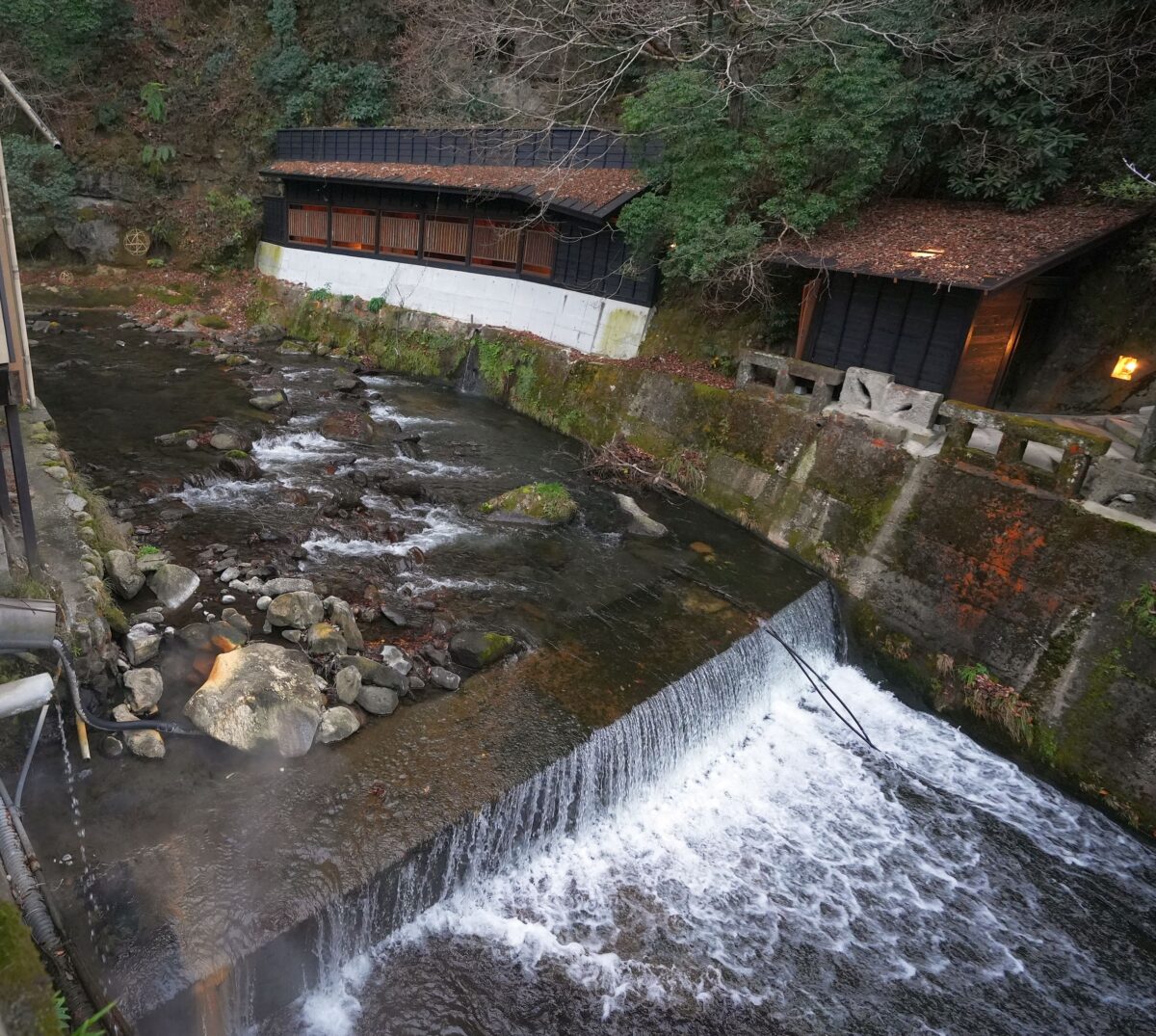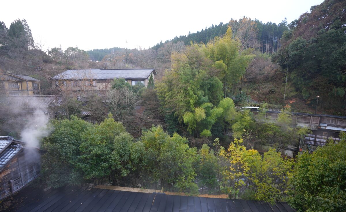 浴槽から眺める渓流は田の原川で、この川に沿って黒川温泉の宿が並ぶ。