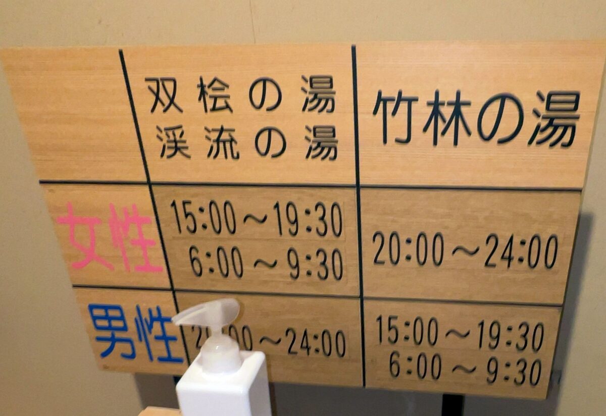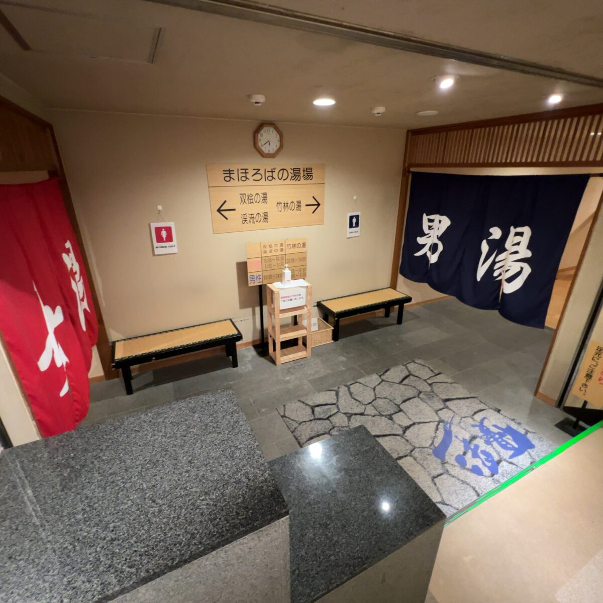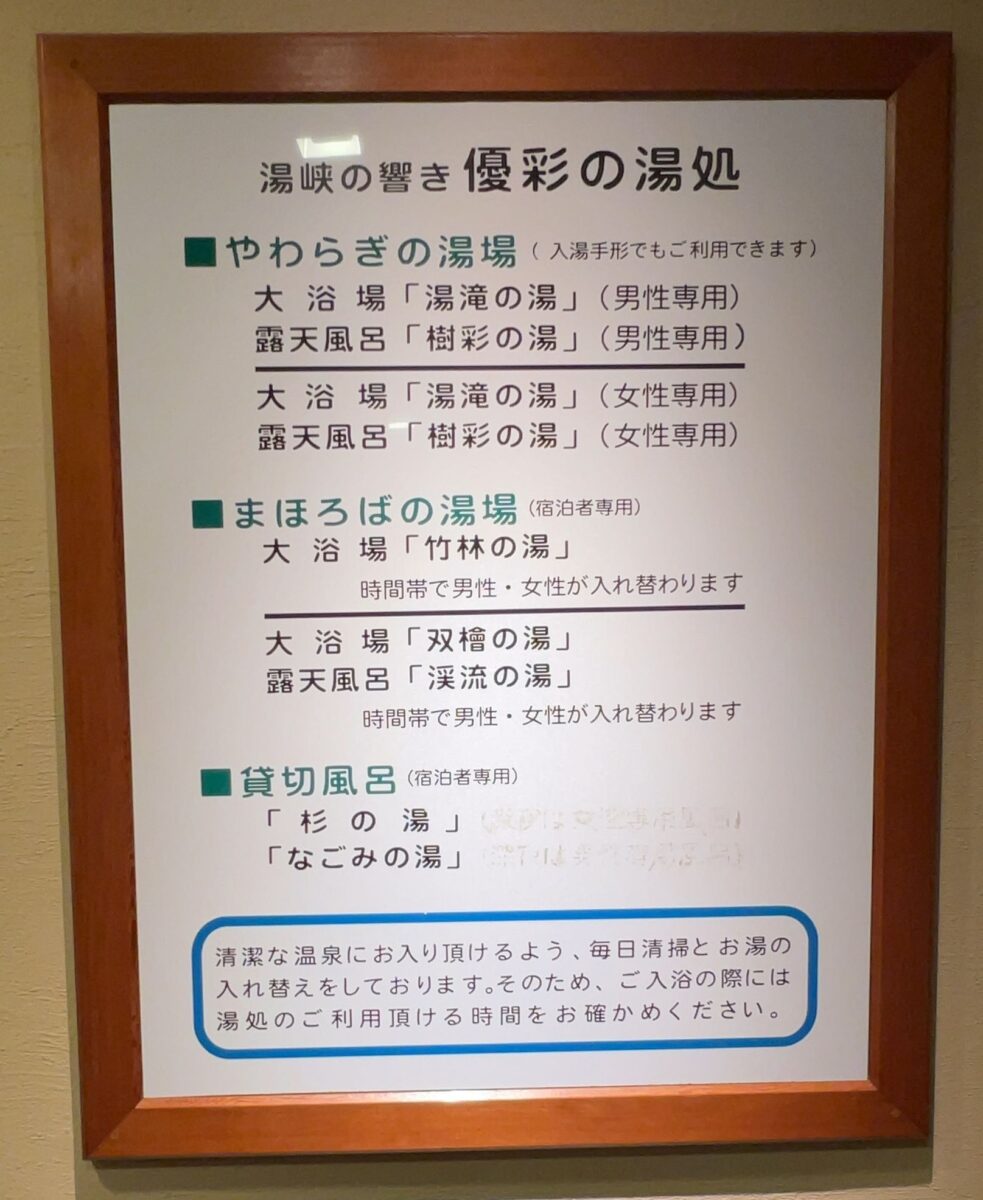 各浴場は「まほろばの湯」、「やわらぎの湯」、「貸切の湯」の3つに分かれていて、日帰り入浴は「やわらぎの湯」の3つの浴場のみ。