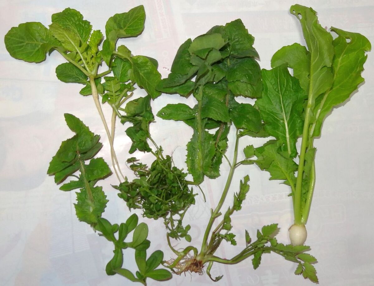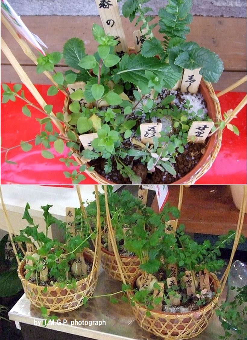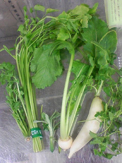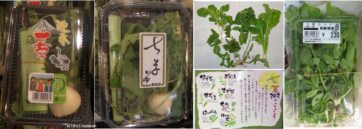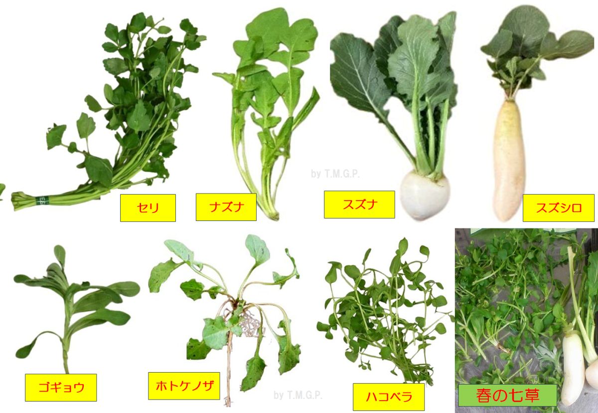 セリ(芹),ナズナ(ぺんぺん草,薺,撫菜),オギョウ(ゴギョウ,御形),ハコベラ(コハコベ,繁縷),ホトケノザ(仏座),スズナ(カブ,鈴菜,菘),スズシロ(大根,蘿蔔,清白)。