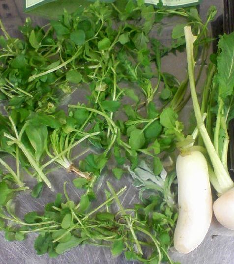 step2 お粥を作る間に、七草を茹でやすいようにスズナとスズシロは薄切りにする。(葉物は後工程で茹でてからカットする)