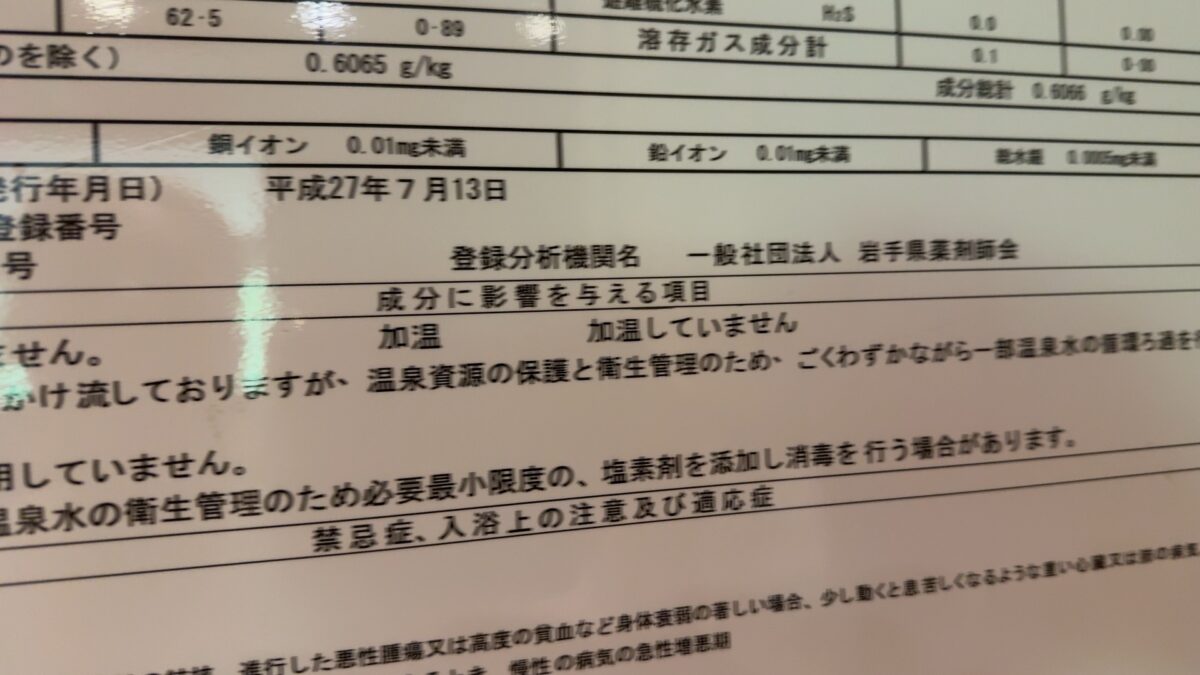 前回(2007年)の温泉分析書では0.4mgだった硫黄成分は今回は何故か温泉基準値超えの総硫黄1.3mg。