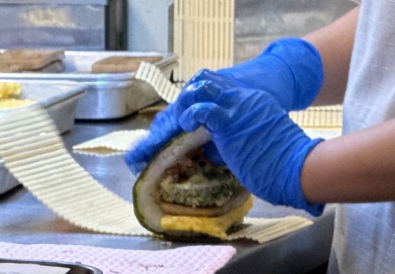 その薄焼きたまごとランチョンミートを海苔とごはんの上に乗せて折りたたむと出来上がり。