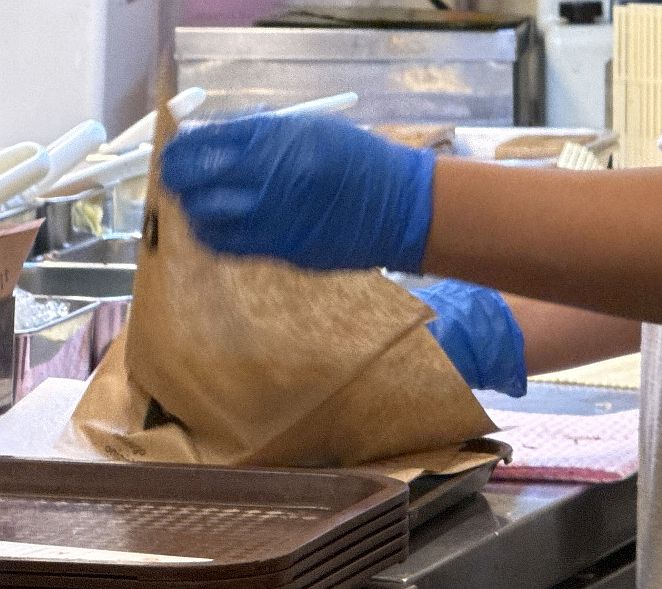 10組少々の待ち時間ながら、注文が3組ほど溜まったら受注をストップさせるという仕組みのようで、なかなか自分の番が来ない。結局、行列に並んでから25分ほど経過してからようやく注文品を受け取ることができた。