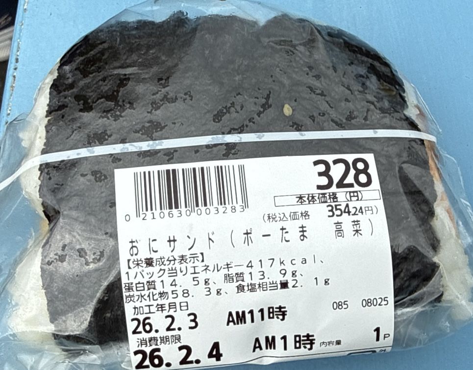 ・おにサンド(ポーたま高菜)354.24円。店内製造。