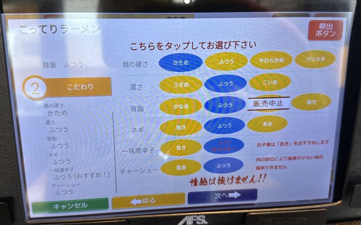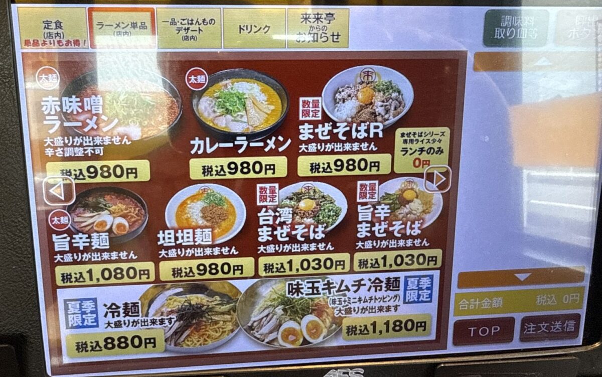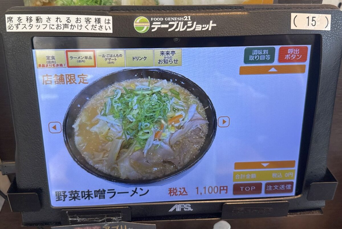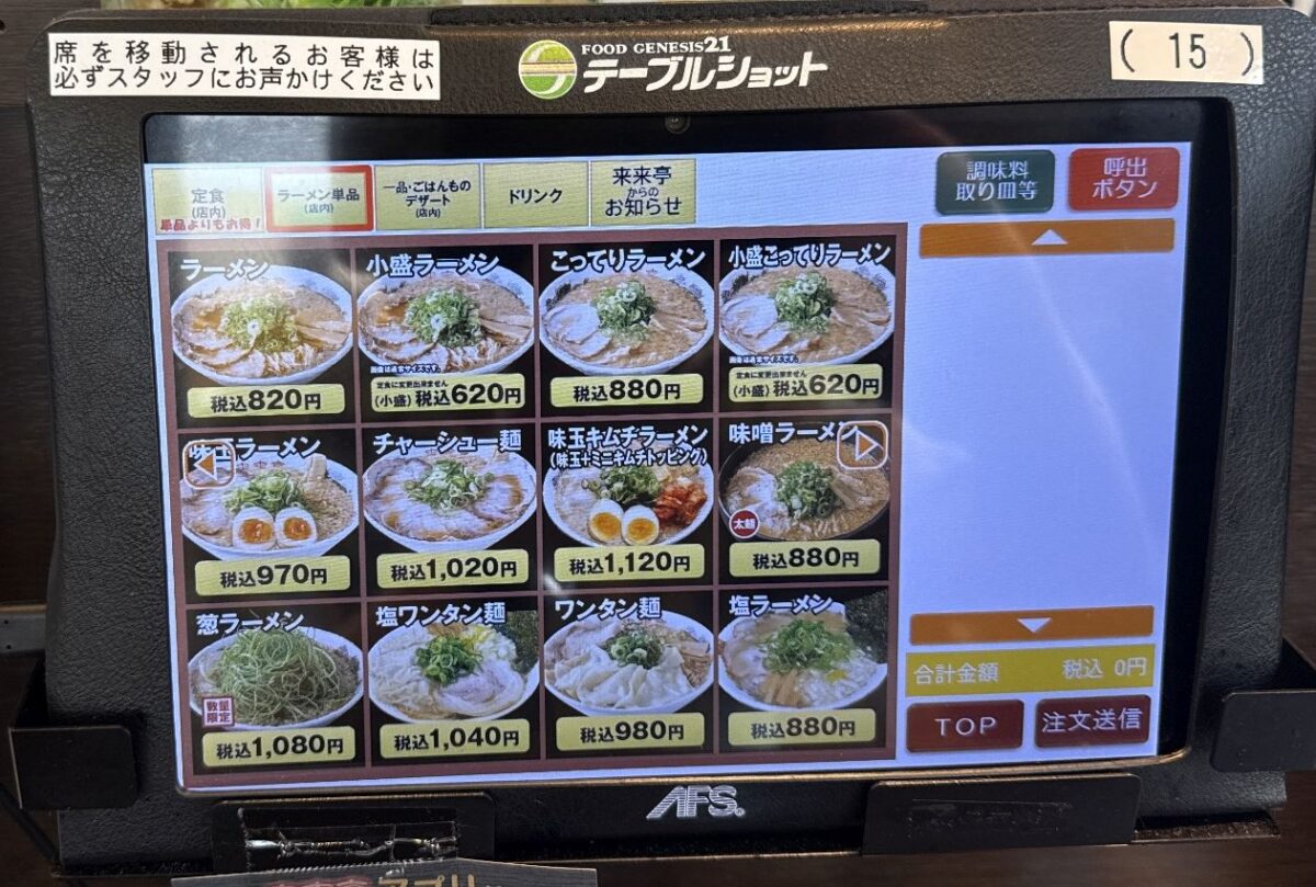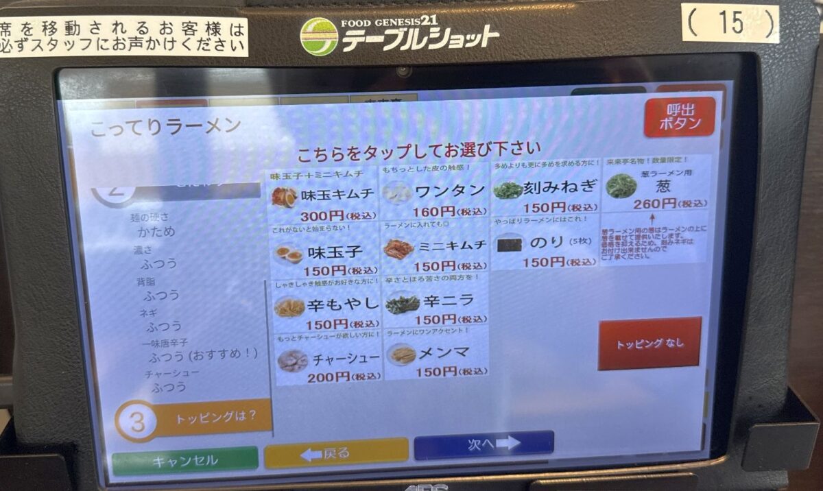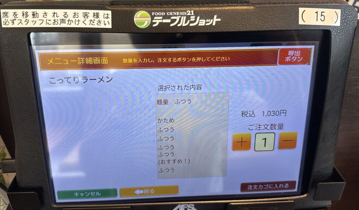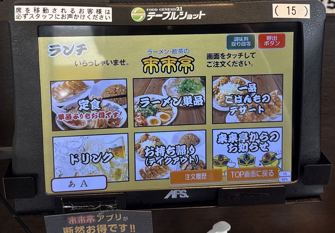 注文は店の都合に合わせなくとも席前のタブレットで注文できるのがありがたい。券販機の前で前客のスロー作業(悩んだり小銭投入だたり)にイラッとすることもなく、注文発生のタイミングを測ることもしなくて良いのがありがたい。
