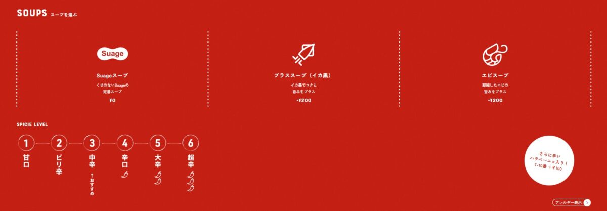 そして、スープ(定番・イカ墨・エビ)を選び、辛さを決定する。