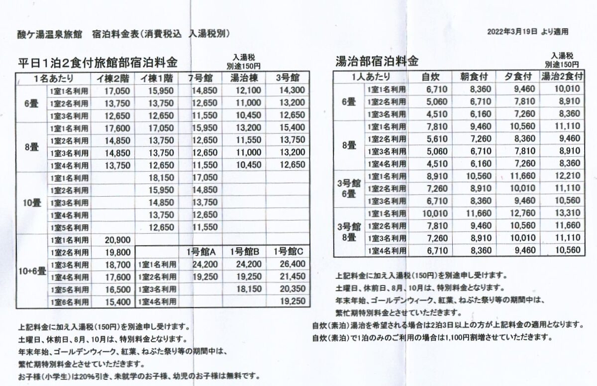 ↓ 宿泊時の価格表(2023年1月時点の価格です。ハンフレットに挟んでありました)