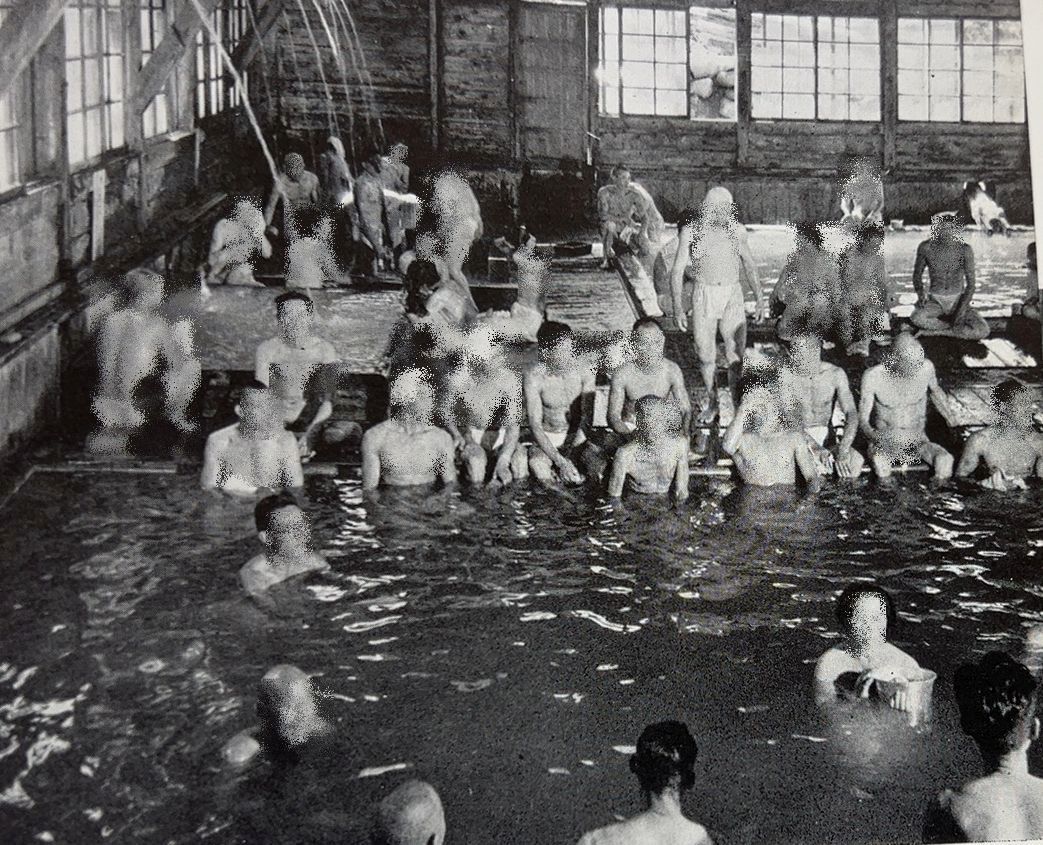 昔の写真を見ると、男性はふんどし着用で、その理由をベテラン温泉学者に問うと「生殖器の精巣を守るため」と教えてくれた。