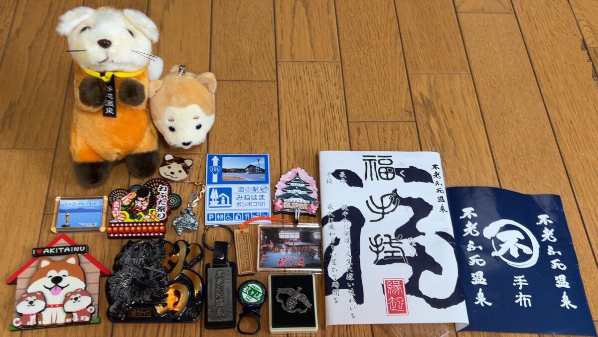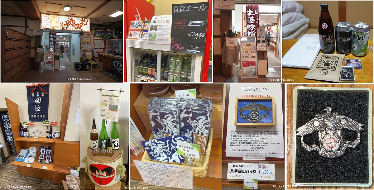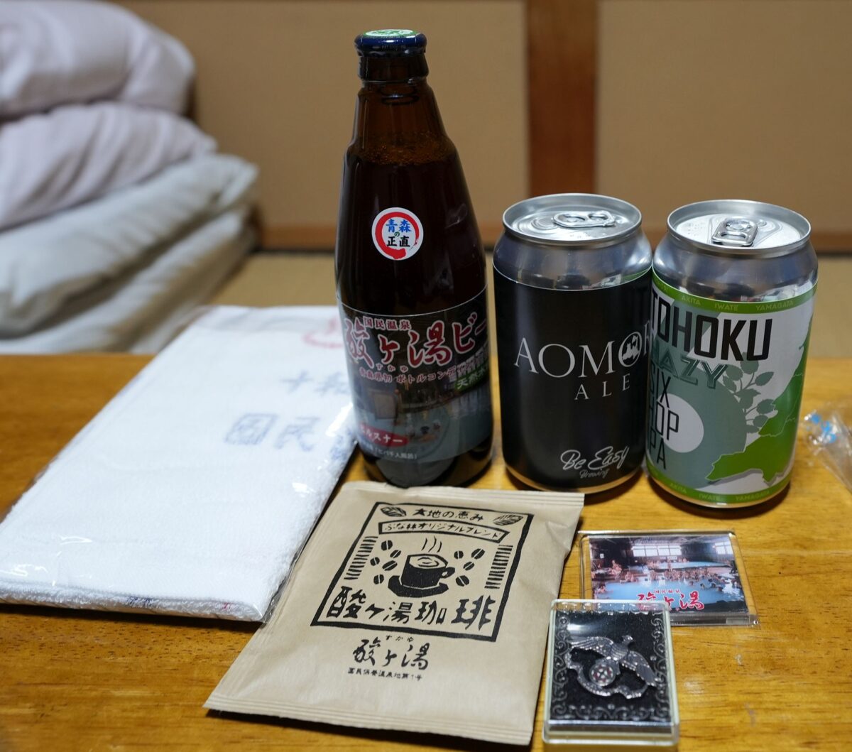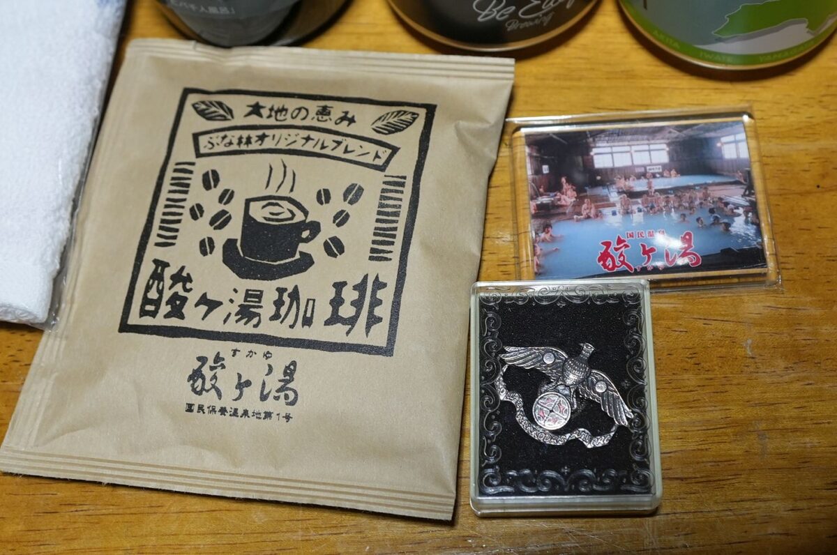 棟方志功バッチと酸ヶ湯温泉マグネット、酸ヶ湯珈琲、酸ヶ湯ビール等を購入。