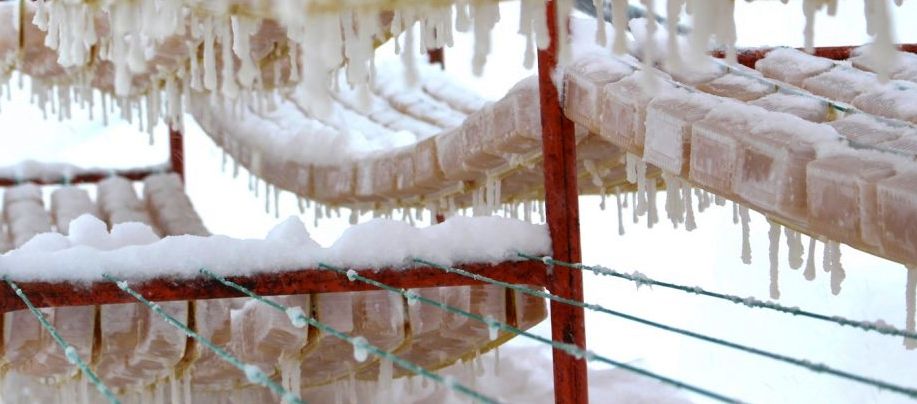 「北の大豆木綿2個分け(タイシ)」650パック(1300丁)を紐でつるし、1日自然凍結させることで「凍み豆腐(しみどうふ)」を造る。