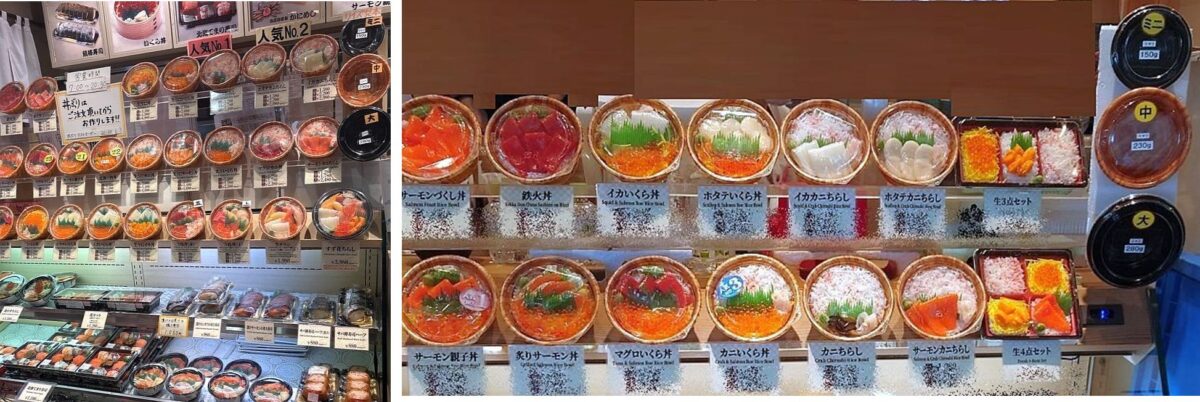 カニ・ウニ・イクラ・サーモン・イカ・マグロ・ホタテから選択でき、注文後に盛り付けてくれる。盛付作業だけなので特にライブ感は希薄。