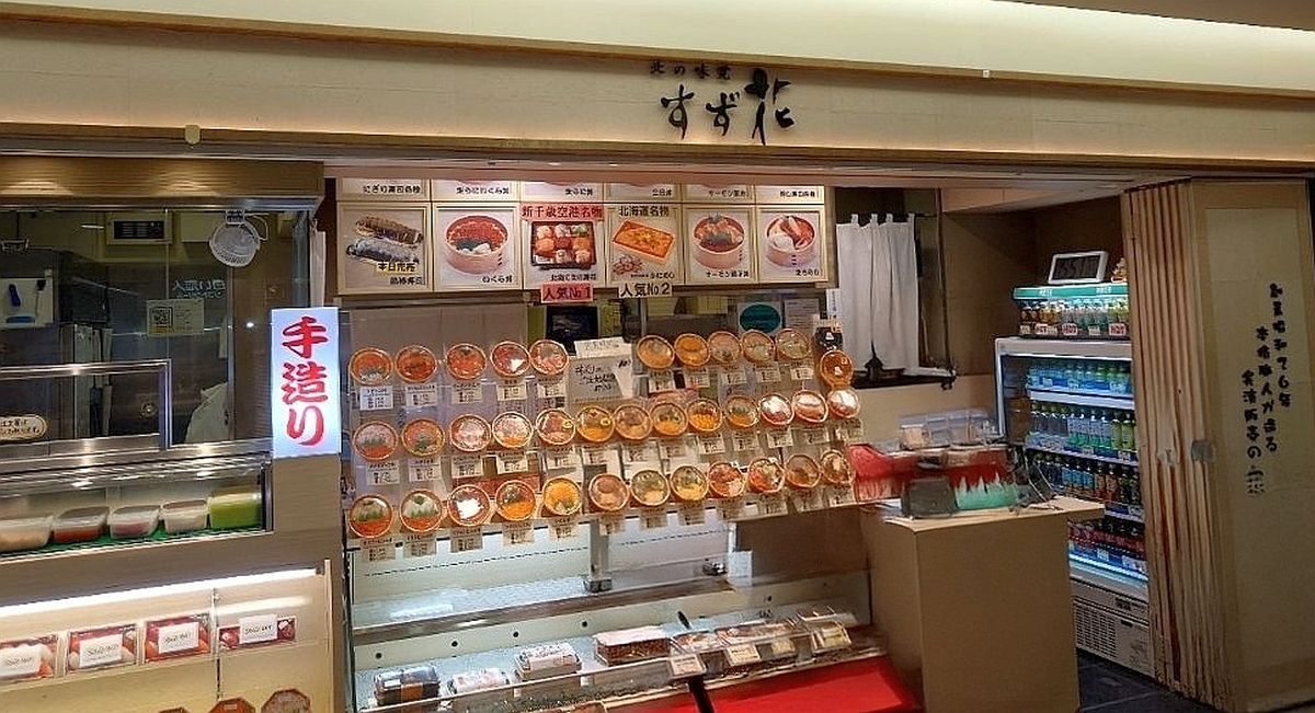 保安検査後のゲート内、ANA側にある「北の味覚すず花ゲート店」のイートイン店舗と、ロビー内(保安検査前)のJAL側にあるテイクアウトの店である「実演空弁 北の味覚 すず花」。