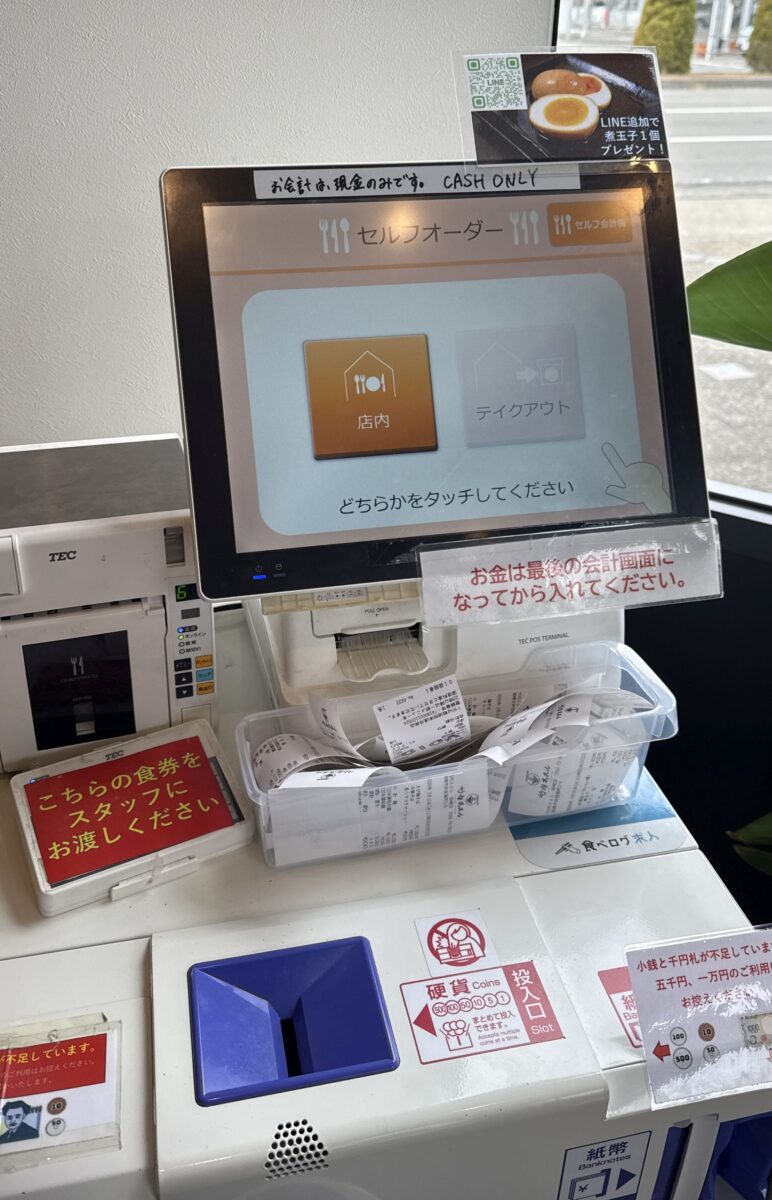 券売機に3名ほど待ち列。まあ、これだったら我慢の範疇。食券を購入。支払いは現状、現金のみなのがちょっと残念。