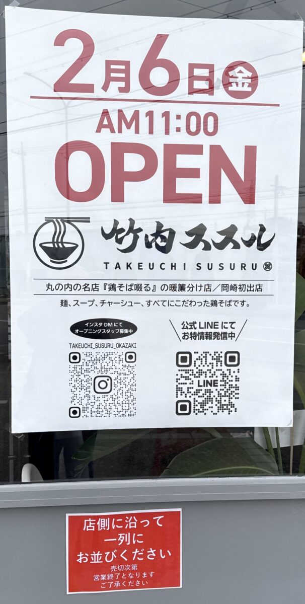 「鶏そば 啜る(名古屋市)」のフランチャイズである「竹内ススル系列(今池・伏見)、鶏そば啜る伏見はなれを運営する株式会社アス・ライズ」が岡崎に出店。