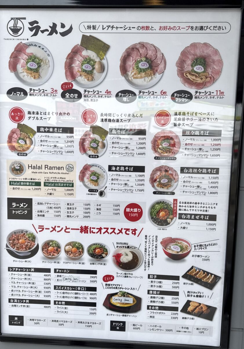 鶏そば,台湾担々(×坦),担々鶏そば,台湾まぜそば,中華そば,お子様ラーメン,ハラルラーメン等々。一品メニューもある。