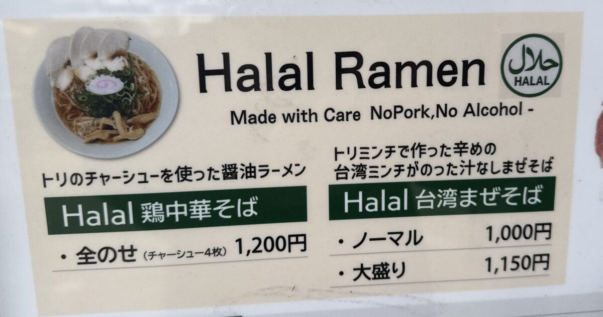 注目は「ハラル中華そば」。人口数百万の都会では珍しく無いが人口38万人の岡崎市(愛知県第3位人口)では珍しい。