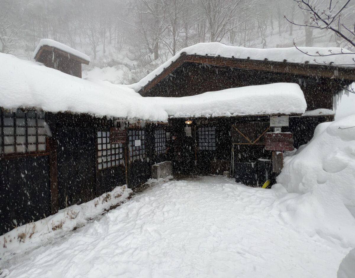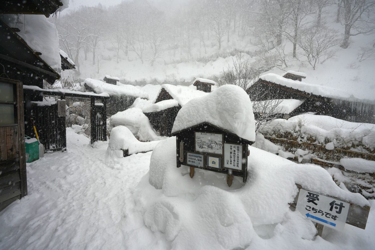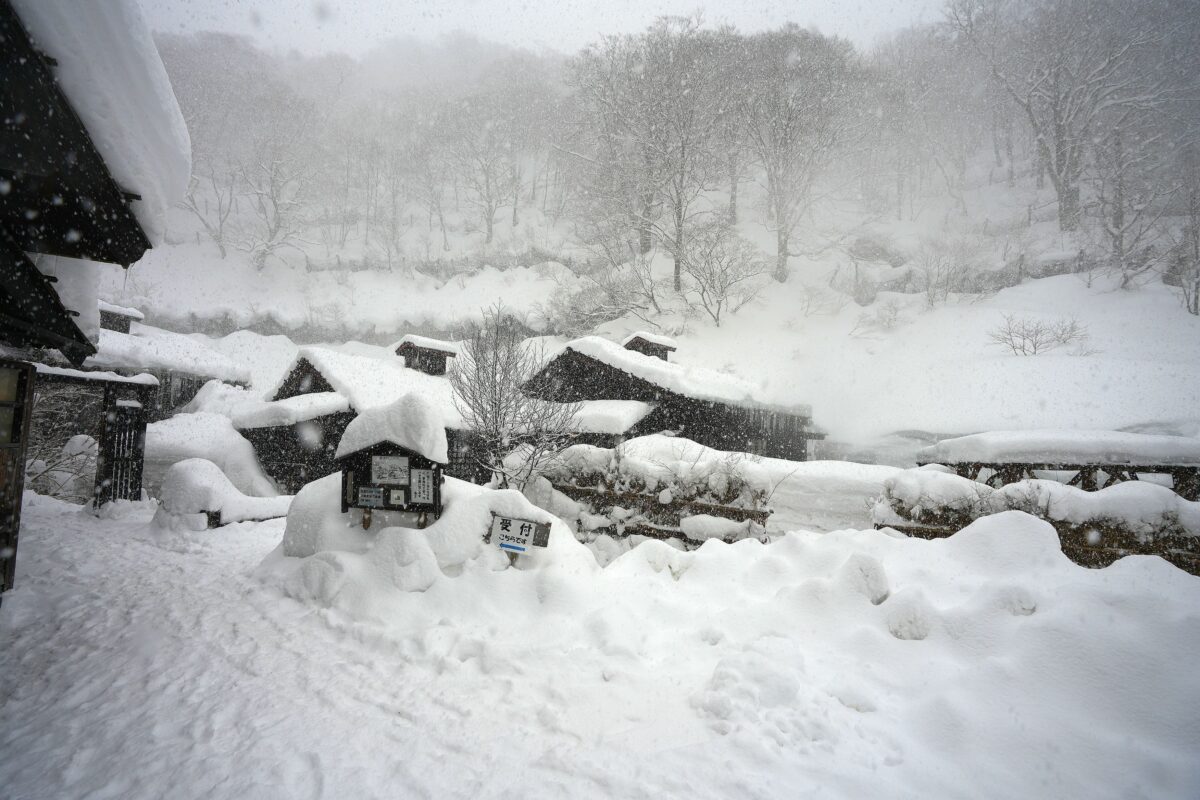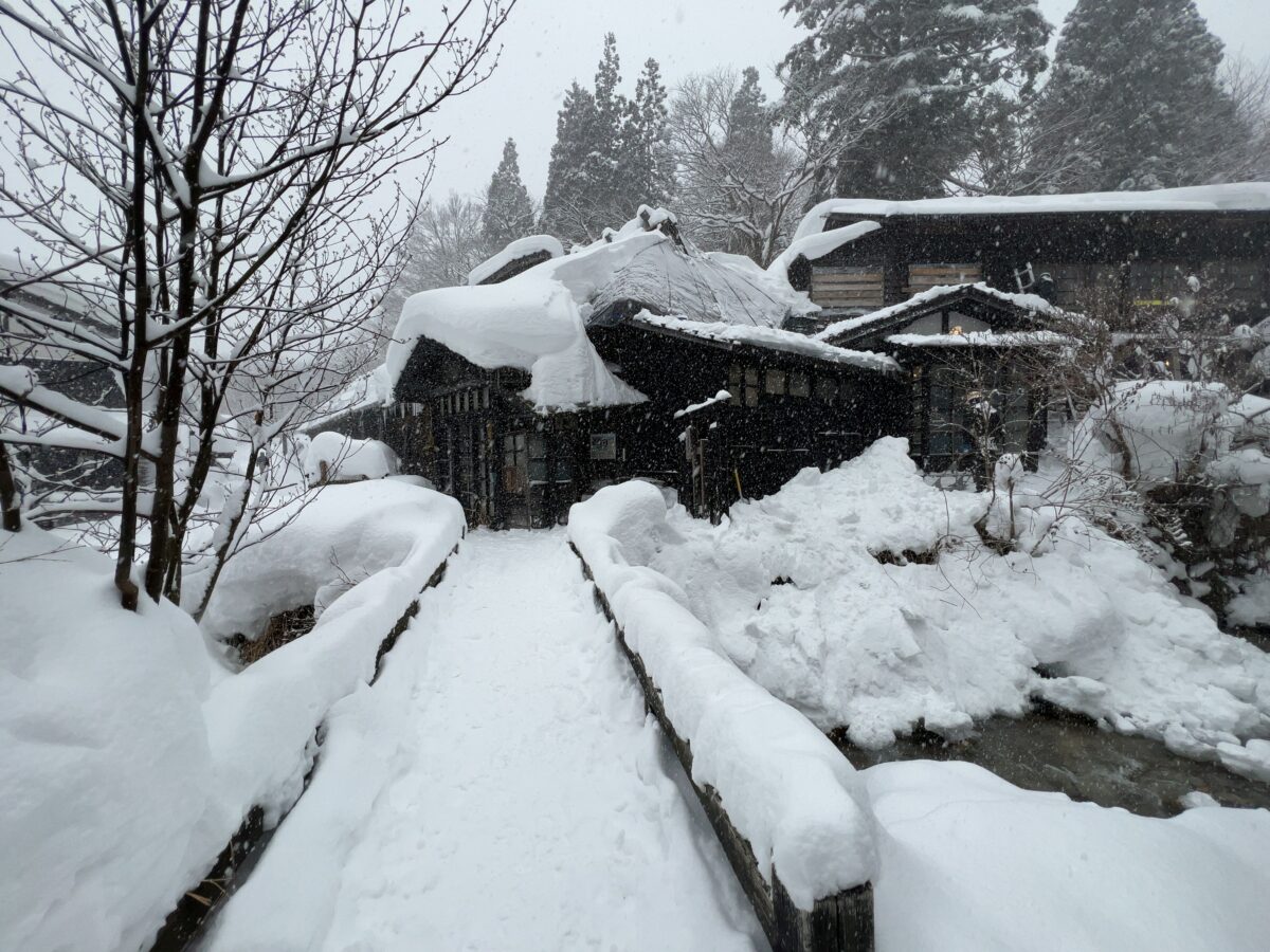 特に茅葺き屋根の本陣を中心に建物が雪に覆われる景色は秘湯宿中の秘湯で非日常感を満喫できる。