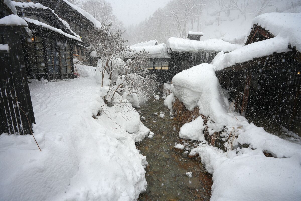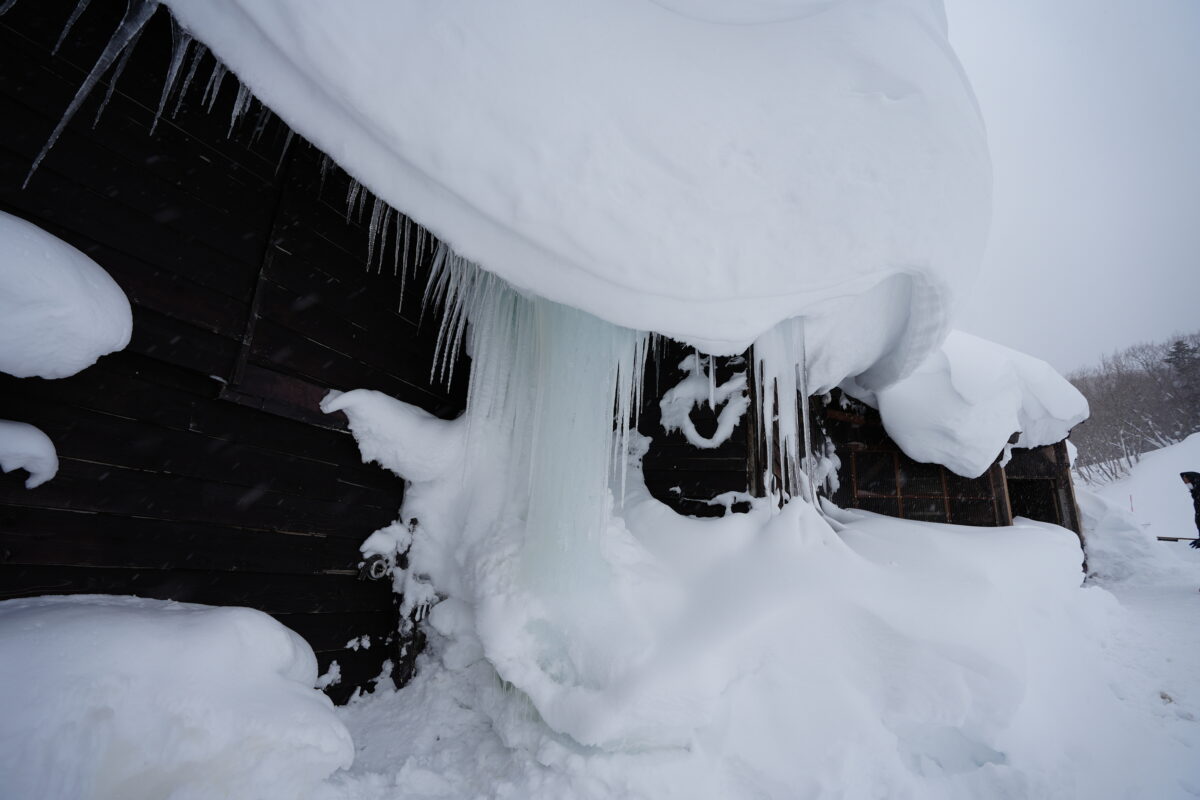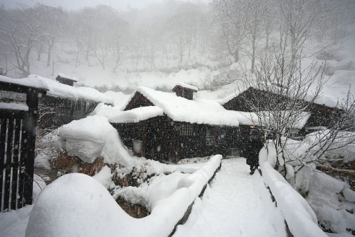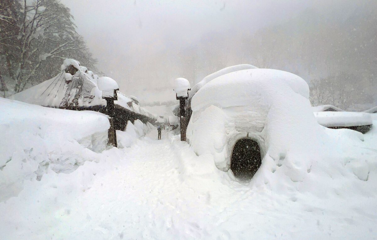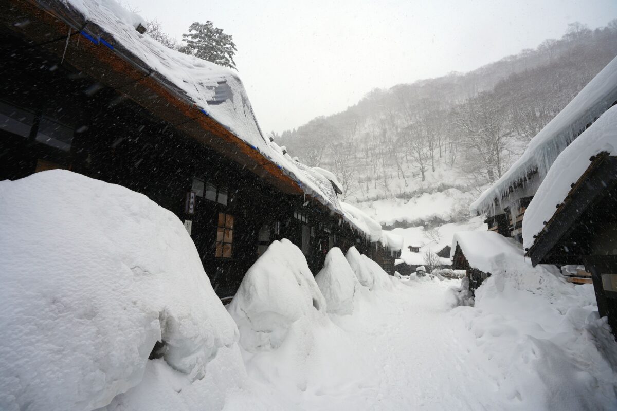 特に茅葺き屋根の本陣を中心に建物が雪に覆われる景色は秘湯宿中の秘湯で非日常感を満喫できる。