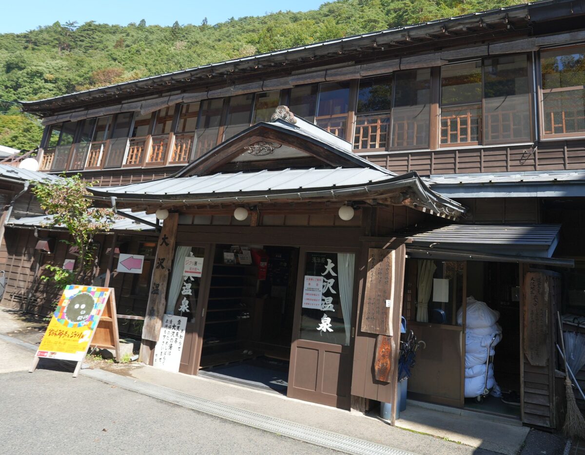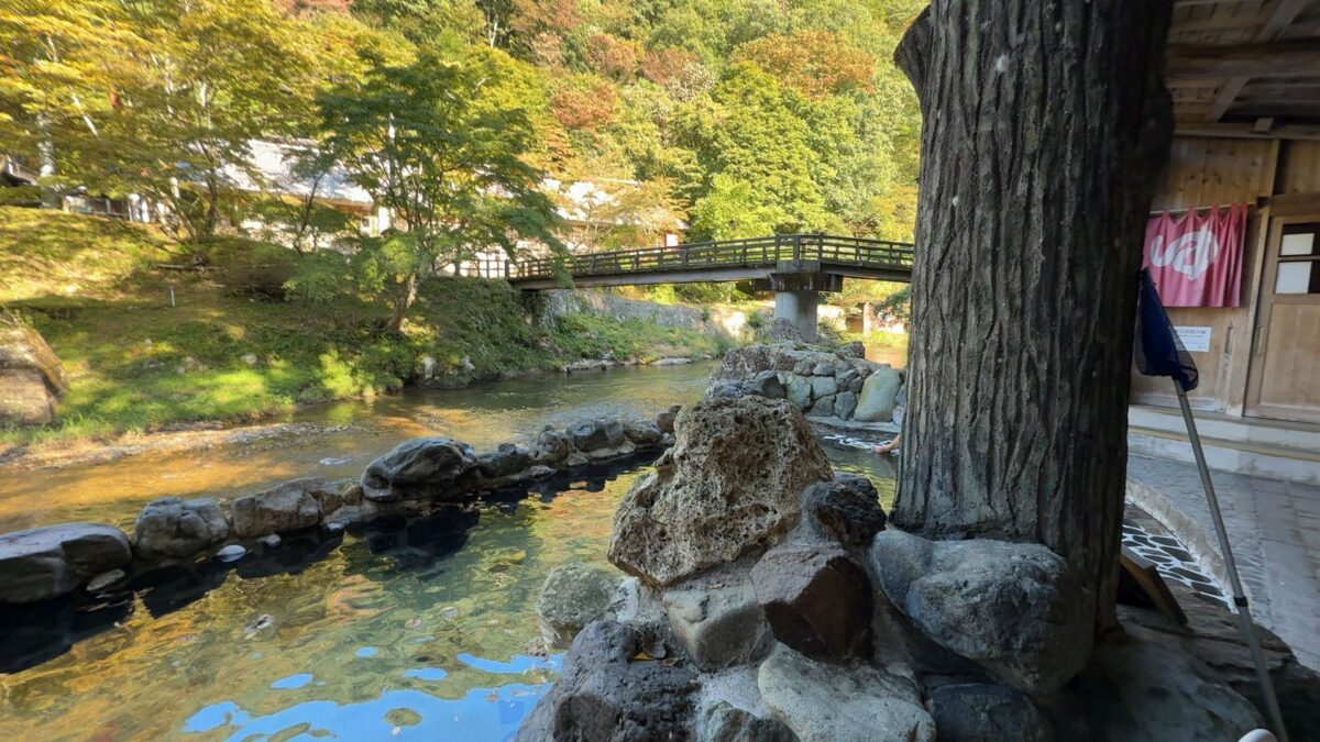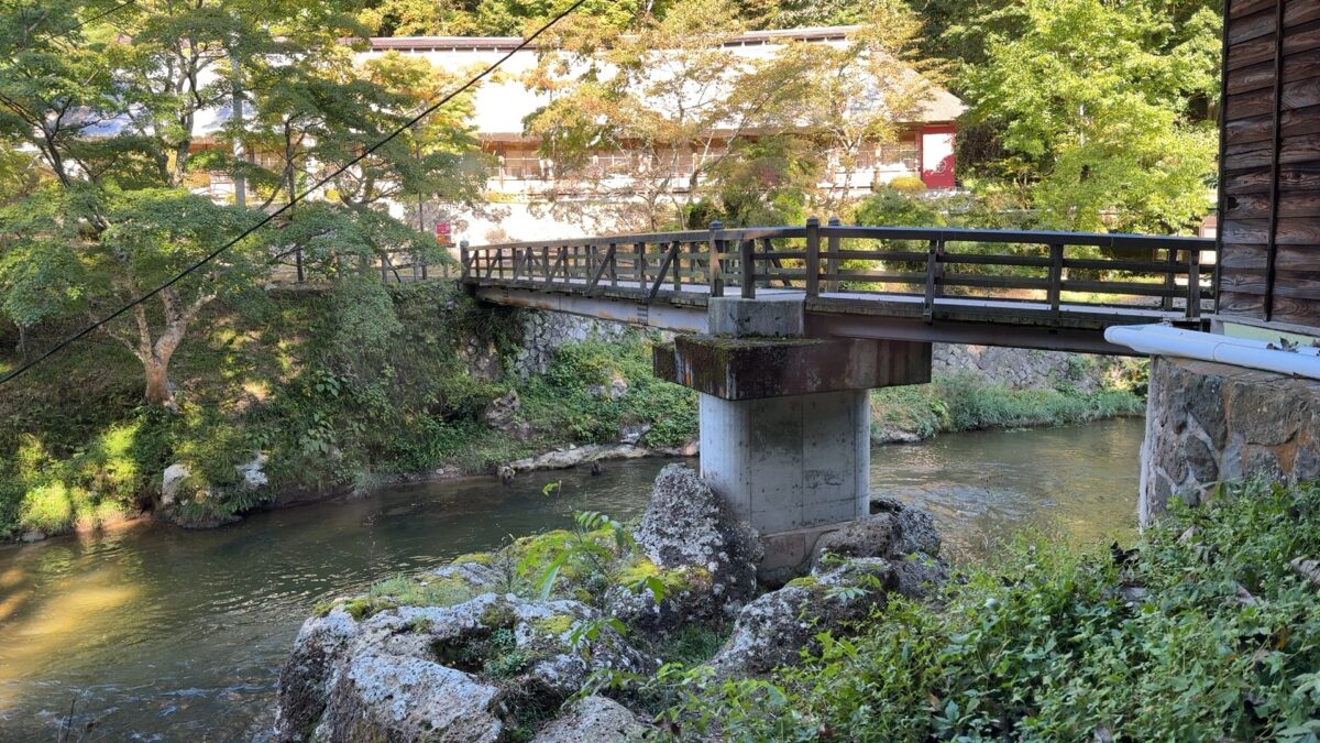 絶景場所は大沢の湯で、露天風呂から眺める「曲がり橋」や対岸の「菊水館」を含む景色が素晴らしい。