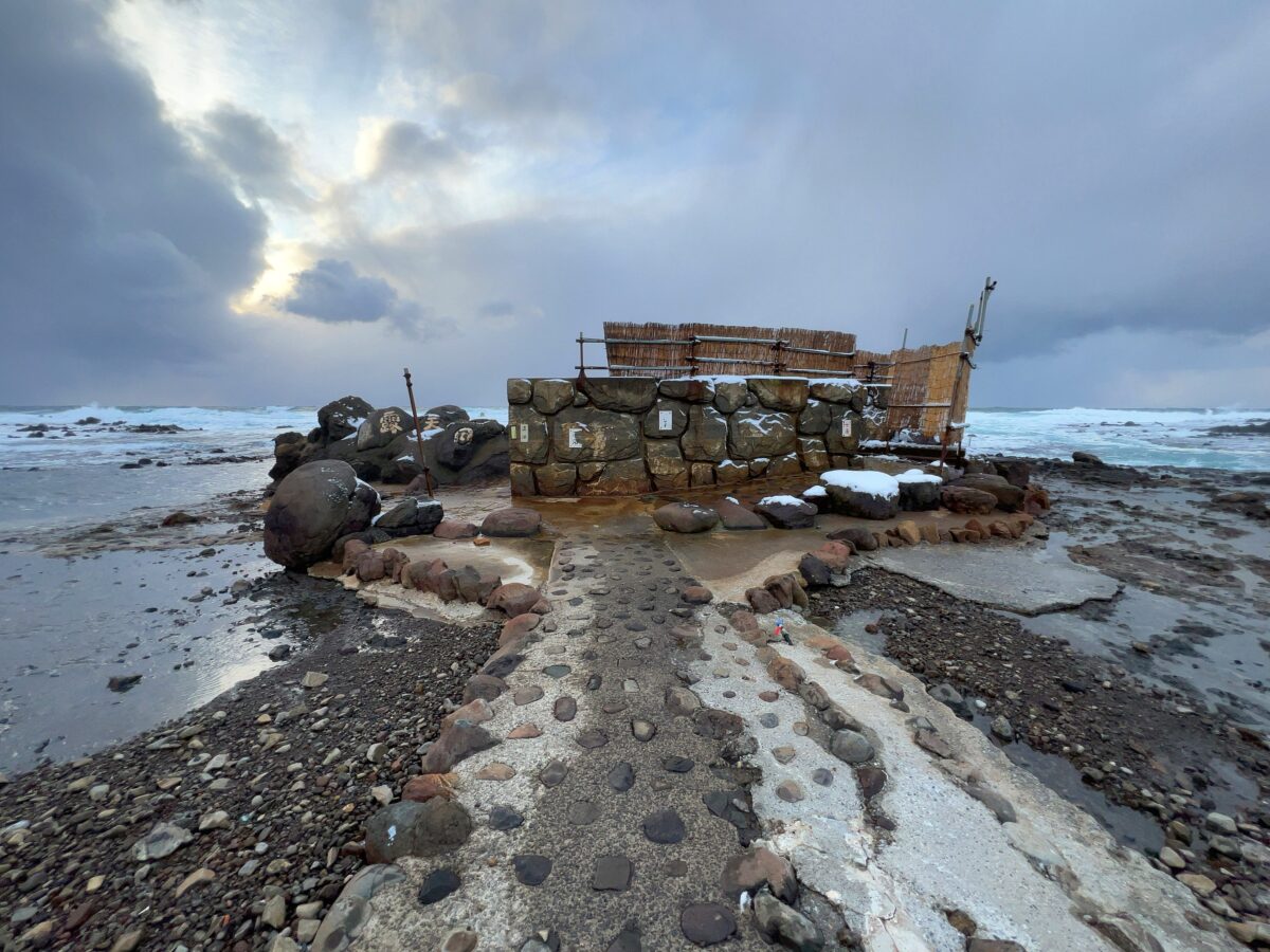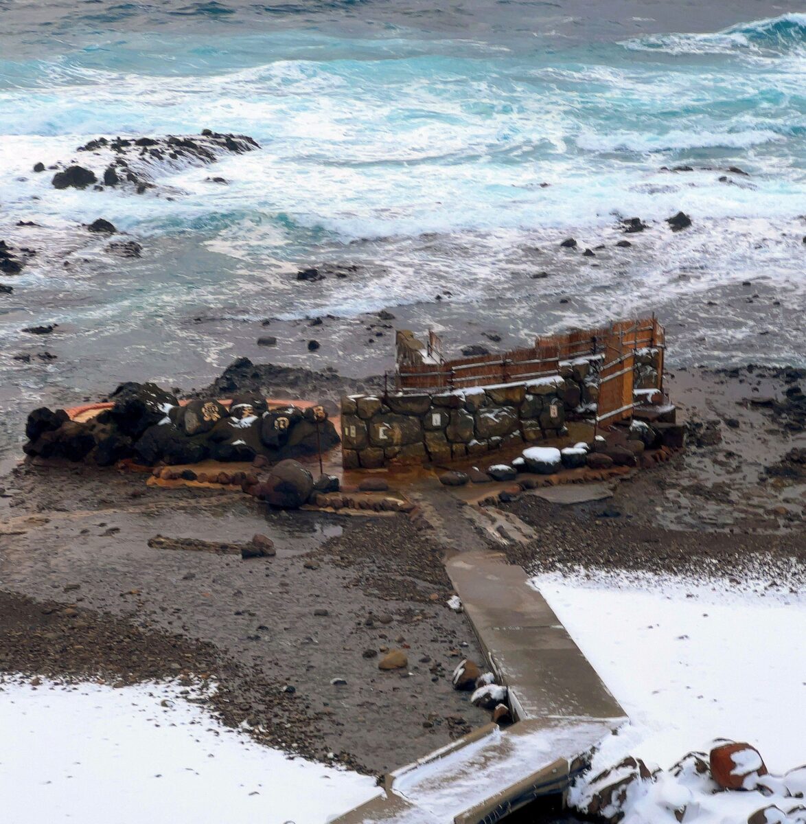 温泉は溶存物質 28,990mg/kgという高張性温泉ながらも頭を吹き抜ける寒風のおかげでじっくりと浸かる客続出。
