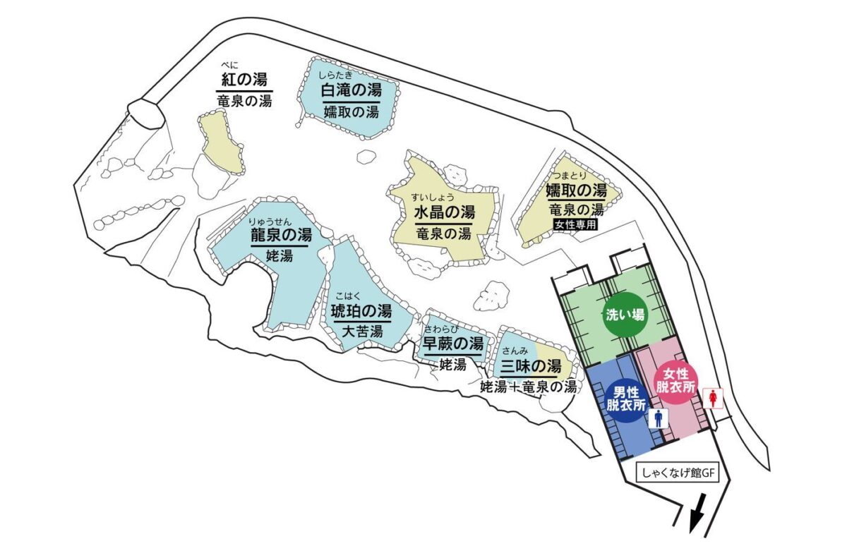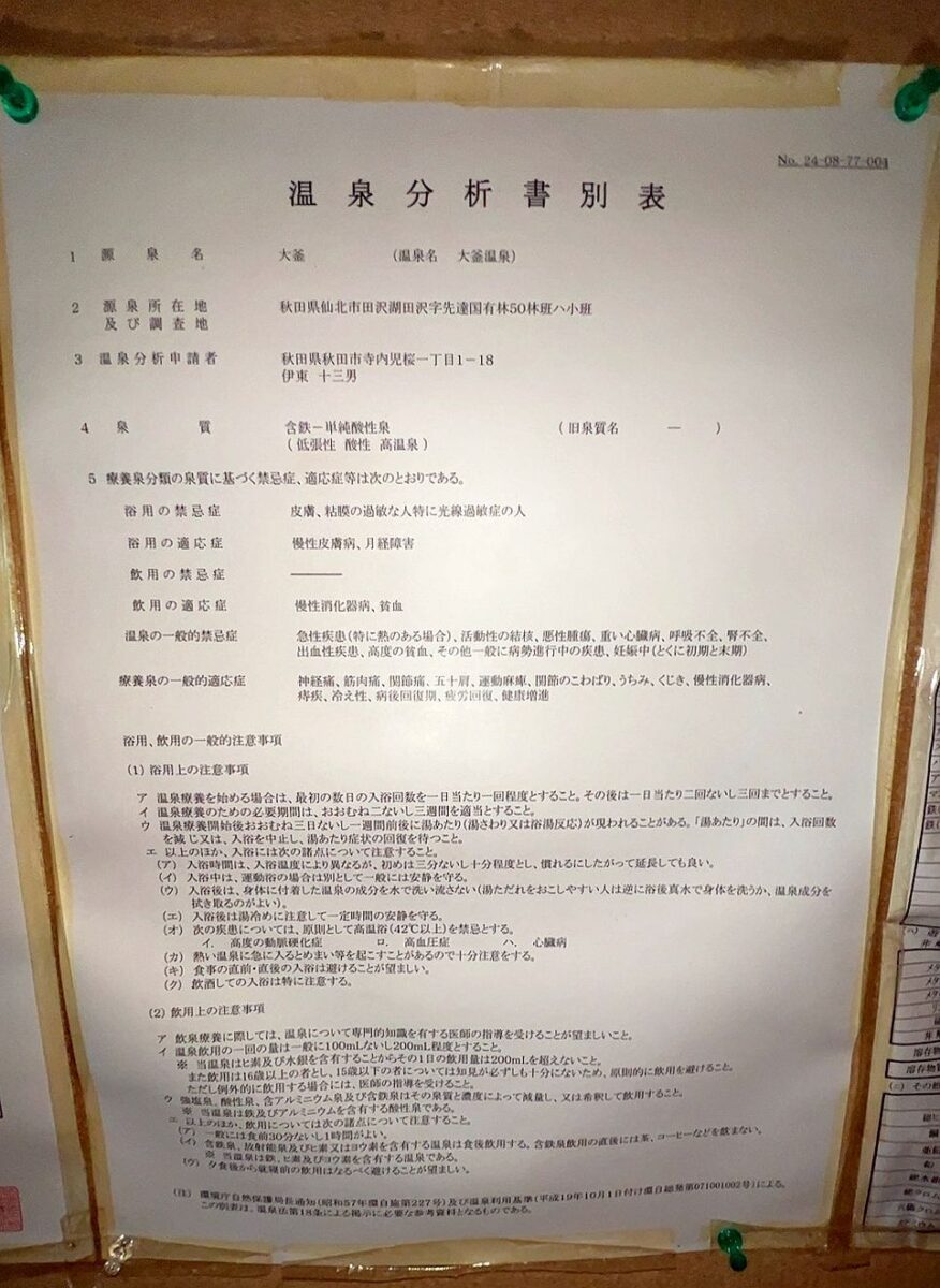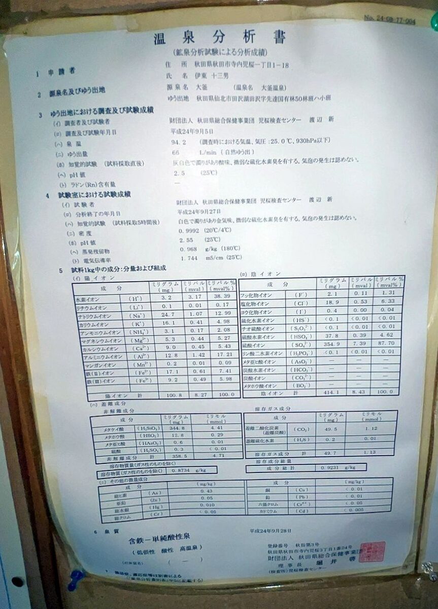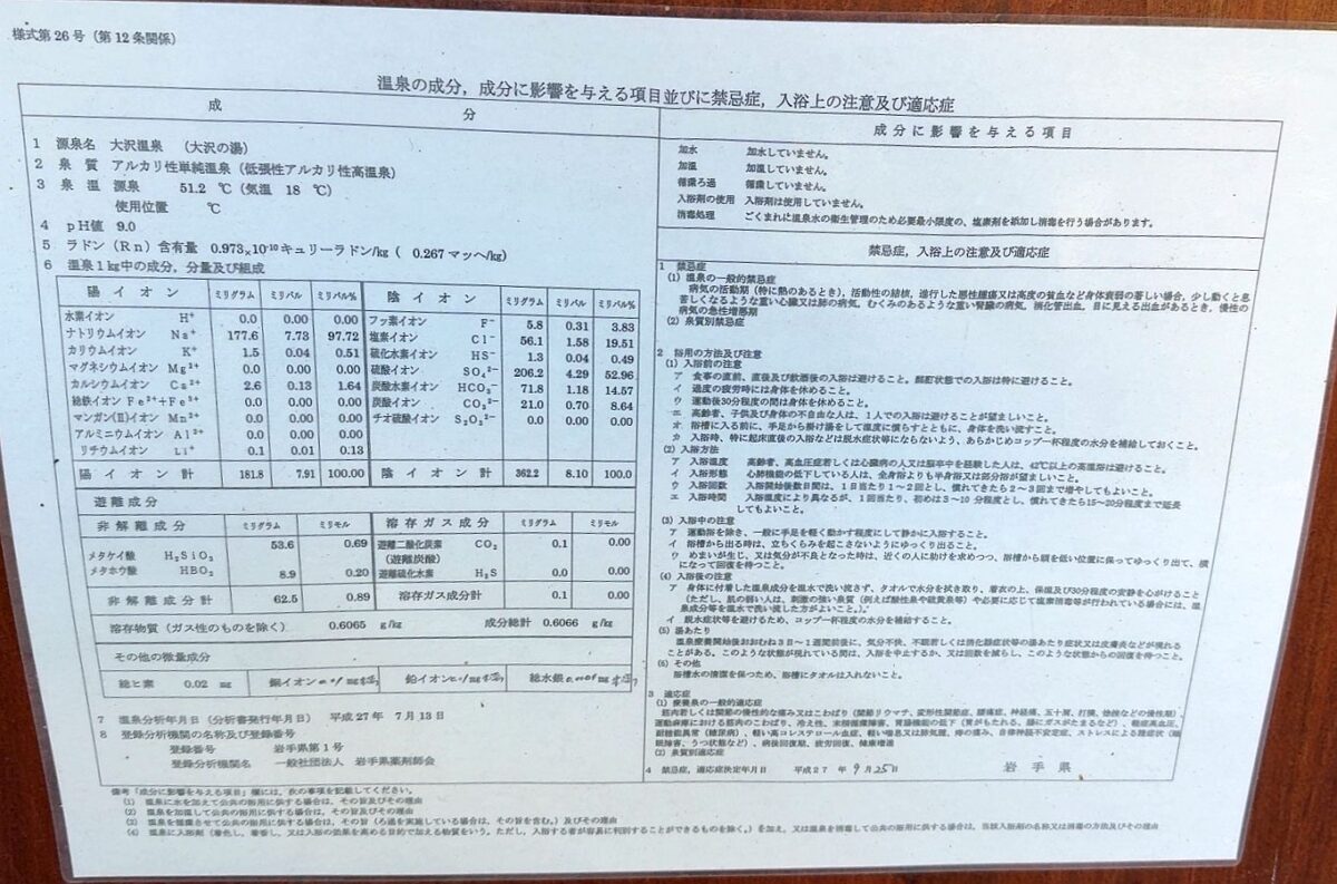 標高1800mの高原でありながら冬でも営業しているというのが特徴で、且つ日本有数の硫黄成分を含有する。泉質は「含硫黄-ナトリウム・マグネシウム-硫酸塩・塩化物泉(硫化水素型)」で源泉によって微妙に異なるので好みの泉質と溶存量で選べるのがありがたい。