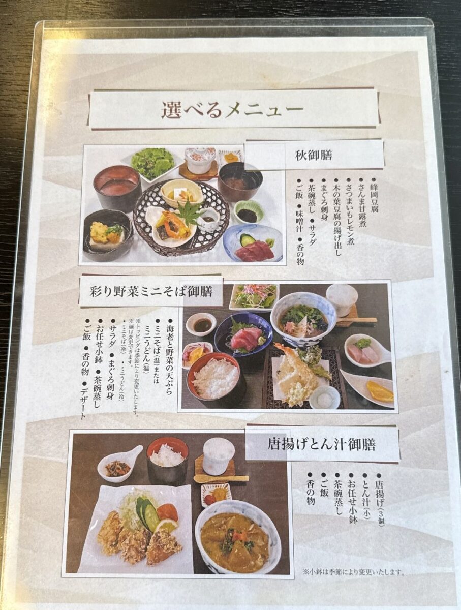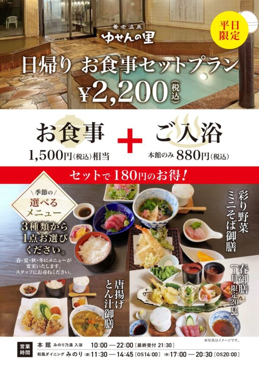 平日限定「温熱療法館+本館+選べる食事プラン」の“選べる食事”は「秋御前(1800円,季節メニュー」「彩り野菜ミニそば御前1,550円」「唐揚げとん汁御前」の3品から選択することができる。
