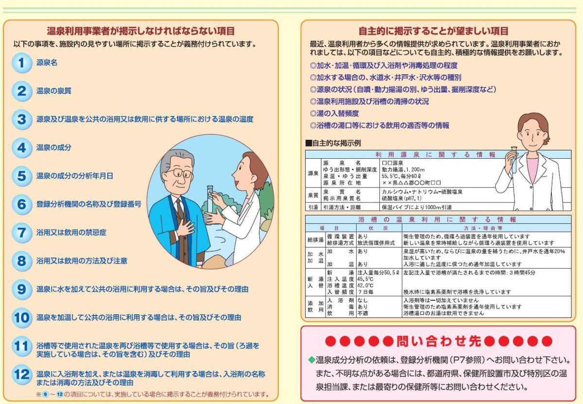 温泉分析書そのものの掲示は義務ではないものの、大切な情報なのでできるだけ多くの情報を表示していただくと、浴客にとってさらに嬉しい施設となると思います。