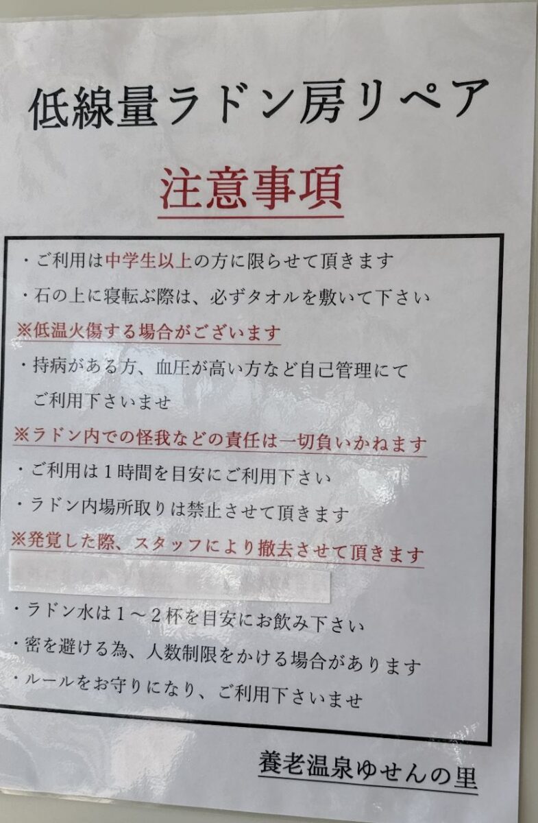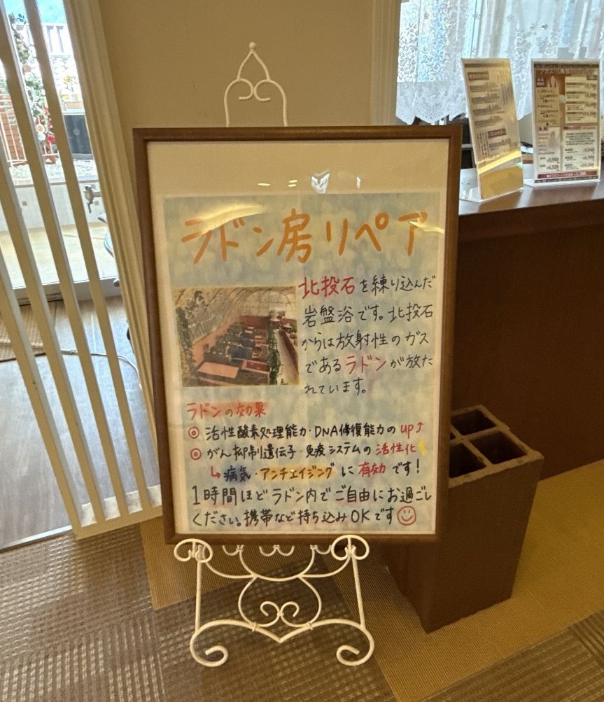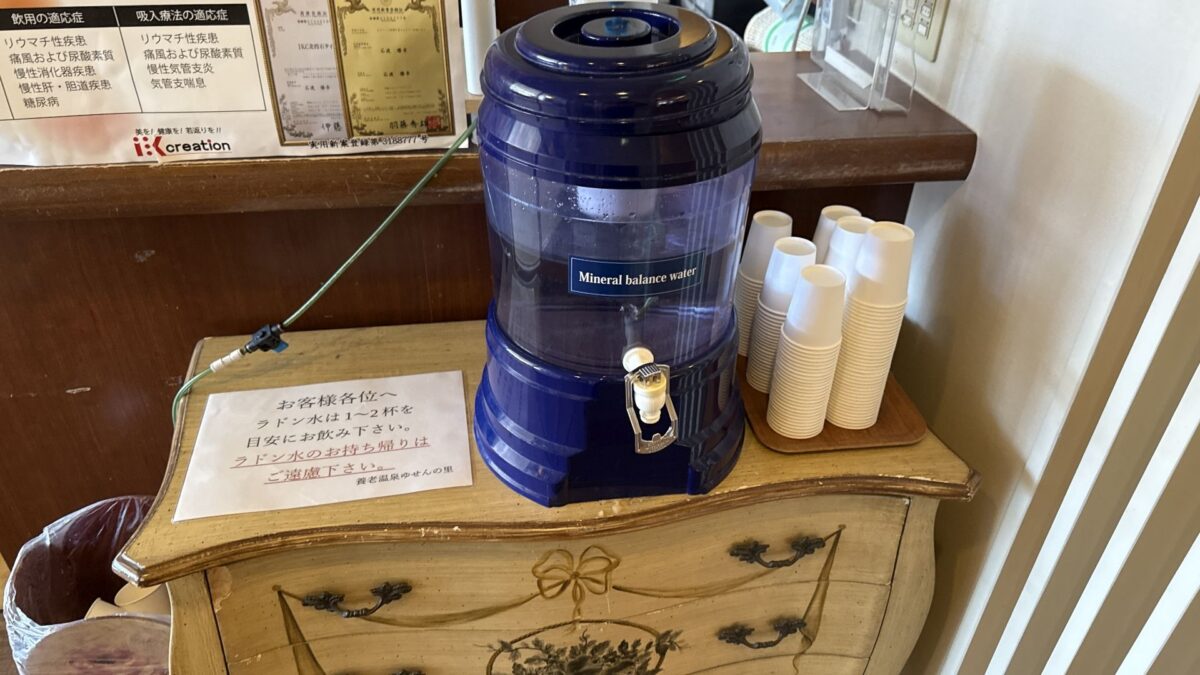 出入口にラドン水が置いてあり、フリードリンク。α線・β線・γ線合計数値を計測すると、こちらは某有名放射能泉の飲泉数値の半分程度。淹れたてだったらもう少し高い数値になるかも知れない。