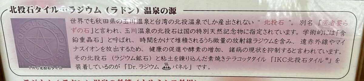 北投石やバドガシュタイン鉱石などの微量の放射線を発する岩石からラジウムが崩壊する過程でラドン222を放出。ラドン222の半減期は3.825日で、その間に放射線、例えばα線(アルファ線)が活性酸素を除去してくれる酵素の活性を向上させ、免疫増強、老化予防の効果が期待できるとされる。
