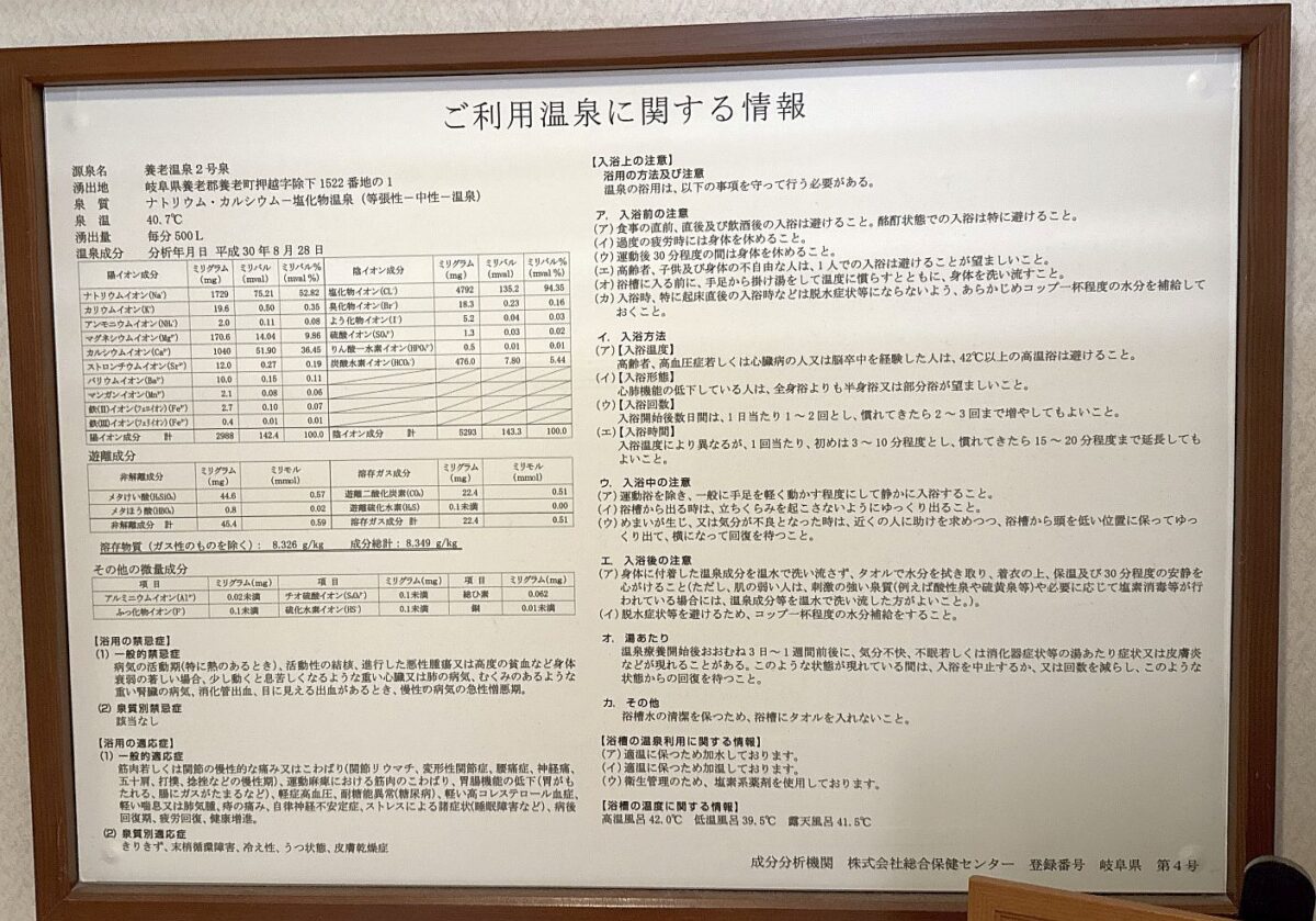 泉質名に表示されている成分はそれぞれミリバル20%以上。(2008年の掲示にはなかったミリバル(%)が2018年版では表示されているのが嬉しい改善ポイント)