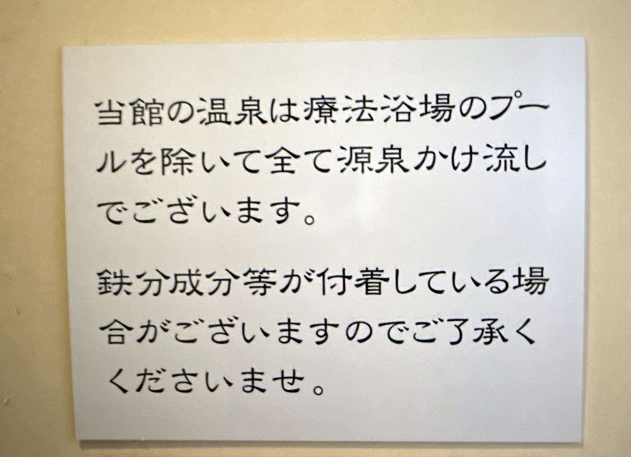 また、浴場には「プールを除きすべて源泉かけ流し」と表示されているので放流式の運用であることを宣言されている。